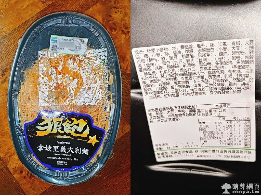 🍝 狠飽-拿坡里義大利麵:熱量 659 大卡、481 公克,售價新台幣 99 元。