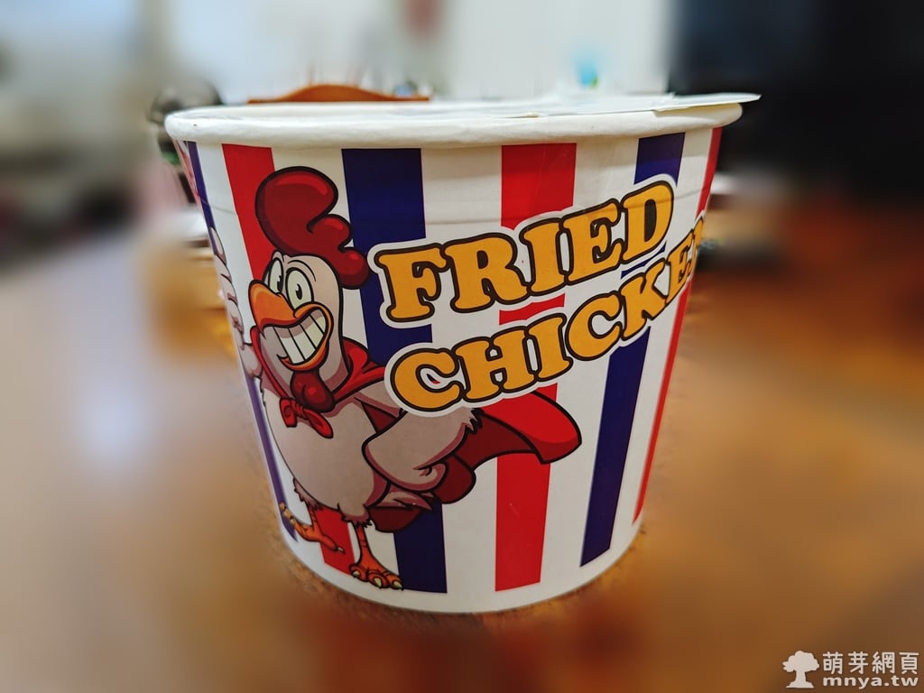 ▲ 歡樂桶的外觀設計頗有美式速食風格,色彩鮮明,桶身印有 FRIED CHICKEN 的字樣與可愛的雞卡通。