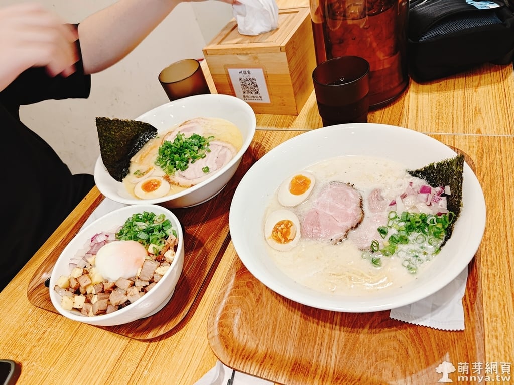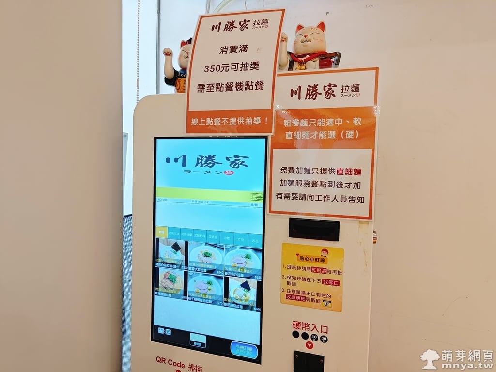 「川勝家拉麵」位在新生路200號,靠近中壢SOGO百貨與威尼斯影城。店家提供拉麵、叉燒飯、冷物、炸物和飲品等,拉麵可微調口味,叉燒有梅花叉燒(全瘦肉)、帶皮-五花叉燒(3瘦肉7肥肉)、五花叉燒(7瘦肉3肥肉)這些選擇,而湯底有重鹹(日本味)、普通(台灣味)及清淡這些選項,麵條可選粗卷麵或細直麵,另外可選麵條口感,如:軟、適中(略有麵心)、硬(限定細直麵),配料有1.0大蒜、2.0黑蒜及3.0香辣(+10 元),口味調整及搭配相當自由,為一家日式料理店。點餐機點餐,也可掃碼點餐,先付款 💸,可現金、LINE Pay 或電子支付,價位中等,無發票 🧾。有內用空間,環境乾淨整潔,夏日冷氣開放 ❄️,餐具自取 🥢,有免費冰開水可取用。現點現做,製作速度快,約 7 分鐘內全送上。