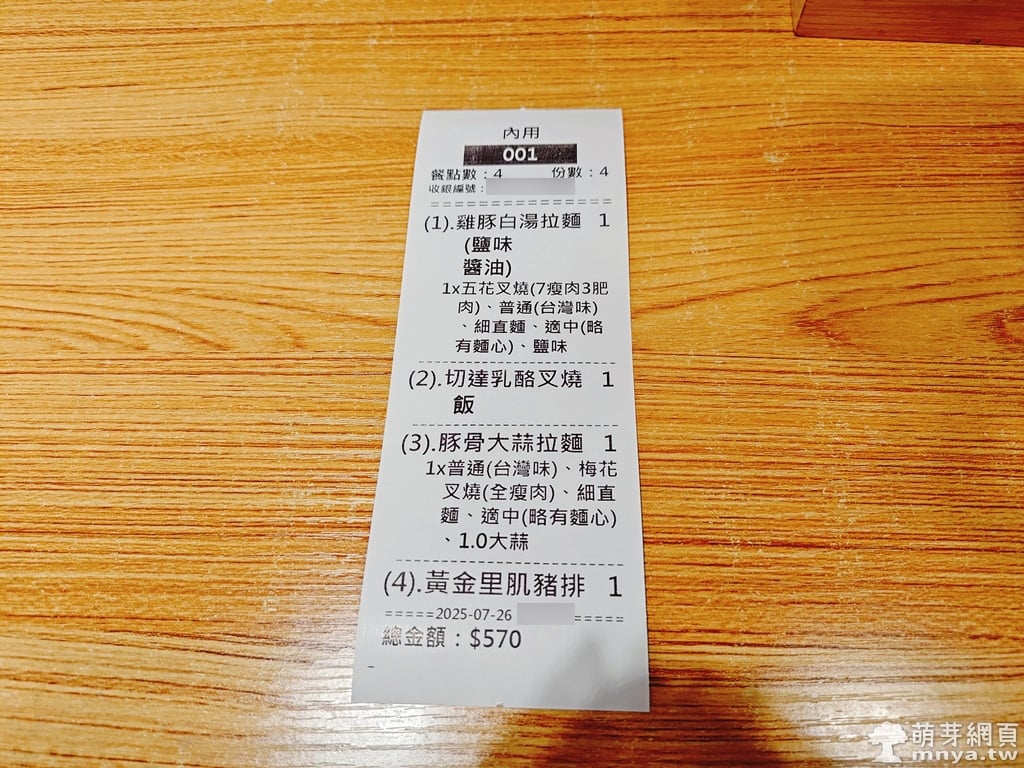 我點「豚骨大蒜拉麵(普通〈台灣味〉、梅花叉燒〈瘦肉〉、細直麵〈適中略有麵心〉,1.0大蒜,240元)」,蒜味很重,相當提味,台灣味確實不會太鹹,吃不習慣太鹹日式口味者推薦,份量充足,可吃飽,好吃 😋;Terry 點了「雞豚白湯拉麵(鹽味醬油、五花叉燒〈7瘦肉3肥肉〉、普通〈台灣味〉、細直麵〈適中略有麵心〉,230元)」、「切達乳酪叉燒飯(100元)」,都份量充足,可以吃飽。另外點餐機滿 350 元可以抽抽樂,抽到「黃金里肌豬排」,免費搭配拉麵吃超爽!