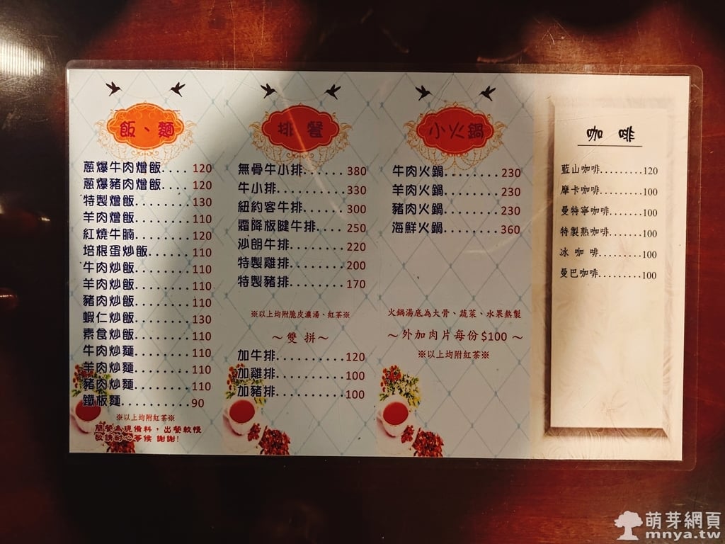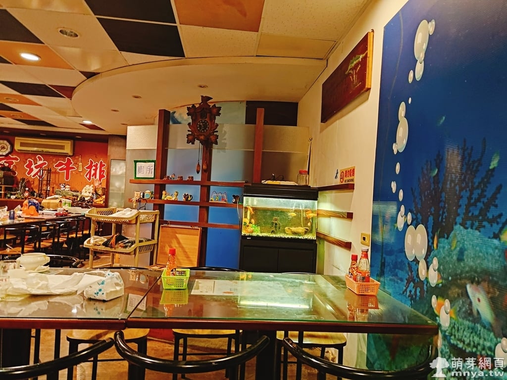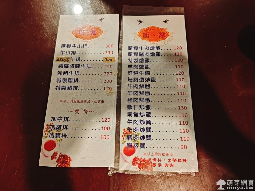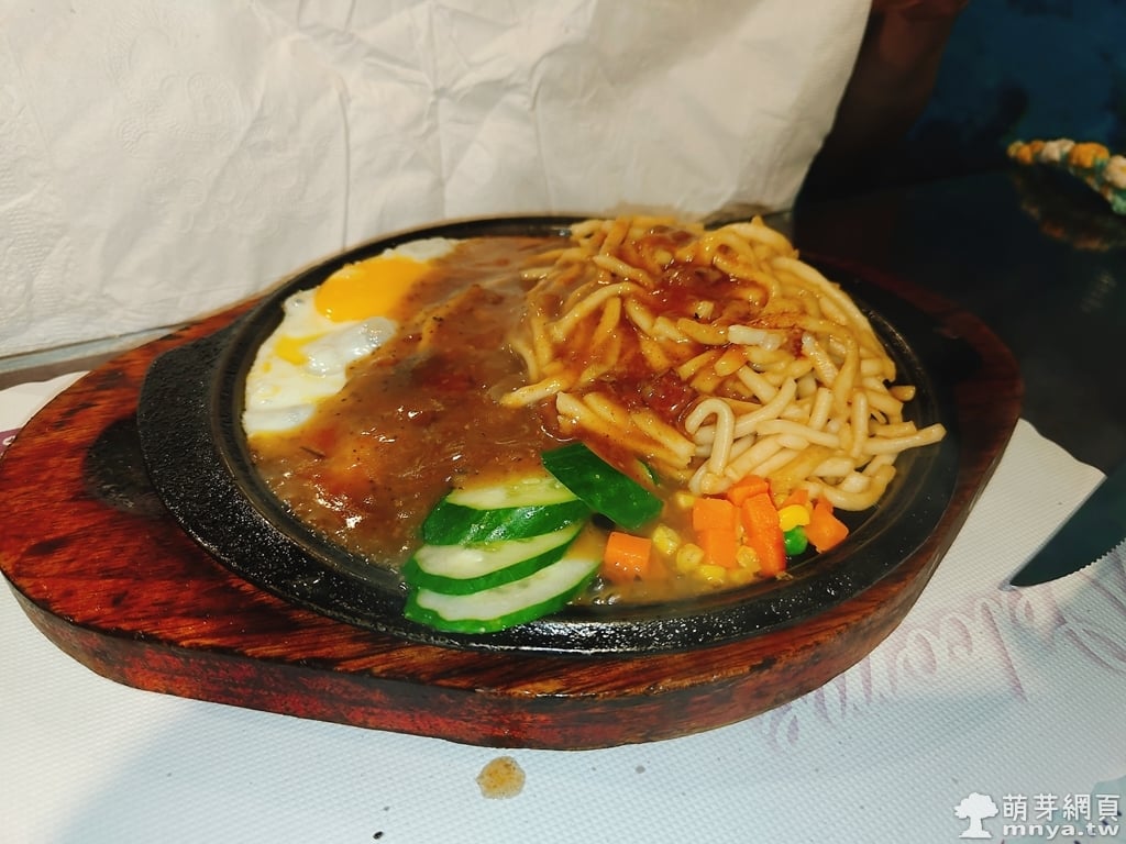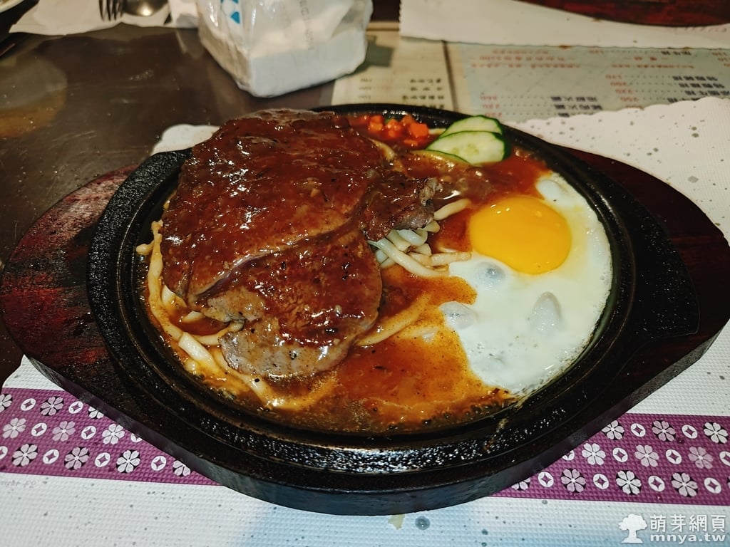 我點「沙朗牛排(220元)」;家人點了「沙朗牛排(220元)」X2、「鐵板麵(90元)」。麵條比較粗,有一顆荷包蛋、小黃瓜切片、三色豆及洋蔥,牛排可調整熟度(我們都選七分熟),筋稍多,有些厚度,口感佳,份量足,搭配附贈的酥皮濃湯,可吃飽 😋。鐵板麵本來不會附湯的,好像因為快打烊了,老闆送了一碗玉米濃湯,非常感謝。
