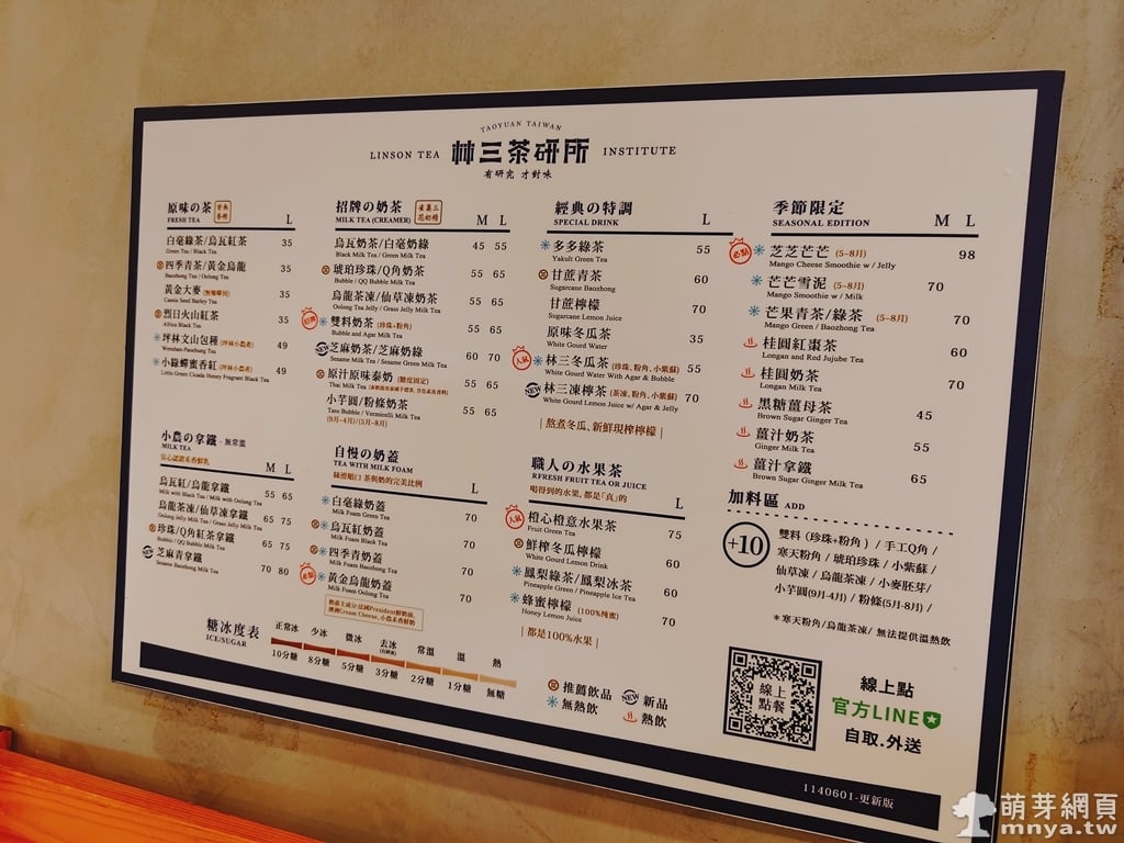 「林三茶研所(蘇澳馬賽店)」位在大同路20路,靠近國道五號蘇澳端。店家有提供原味茶、小農拿鐵、招牌奶茶、自慢奶蓋、經典特調、職人水果茶及季節限定系列飲料,可以自訂糖度(10分糖、8分糖、5分糖、3分糖、2分糖、1分糖、無糖)與溫度冰量(正常冰、少冰、微冰、去冰、完全去冰、常溫、溫、熱),還能加料(+10 元有雙料[珍珠+粉角]、手工Q角、寒天粉角、琥珀珍珠、小紫蘇、仙草凍、烏龍茶凍、小麥胚芽、小芋圓、粉條),選擇多,價位中等,先付款 💸,有發票 🧾,可刷行動支付(街口支付、LINE PAY、全支付),結帳後等待飲料現做,製作速度快。無內用,外帶為主。