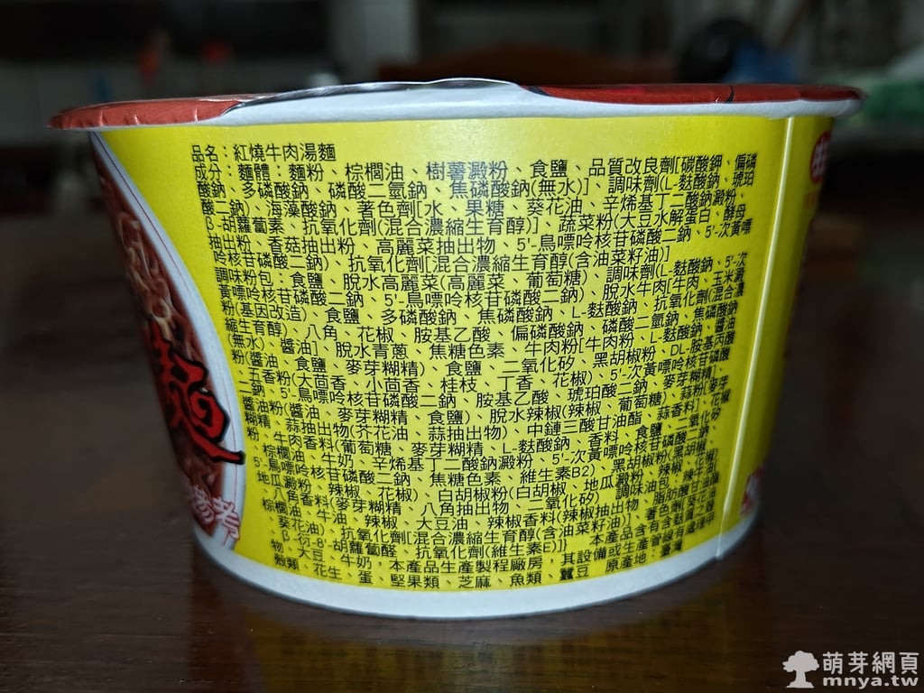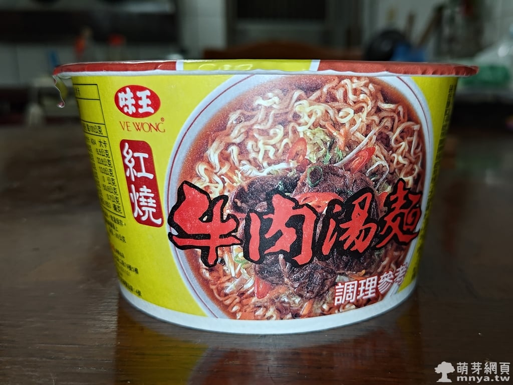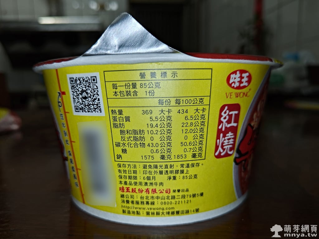 這款味王紅燒牛肉湯碗麵,一碗只要 22 元(美廉社購入),份量 85 公克,採用紙碗包裝,簡單又環保。內容物包含麵餅、調味粉包、調味油包,成分中可見牛肉粉、脫水牛肉與多種香辛料,還特別添加了辣油與牛油提升湯頭層次。