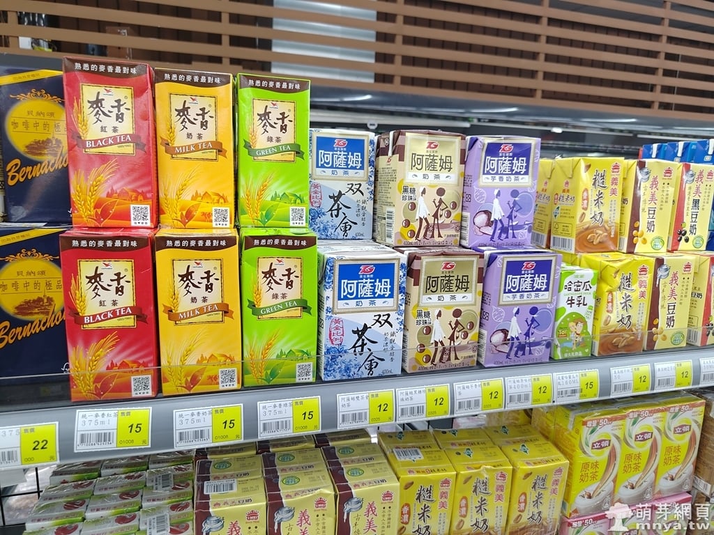 ▲ 紙盒裝飲料排得滿滿,豆奶、果汁、茶飲、乳品類樣樣俱全,而且價格實惠。