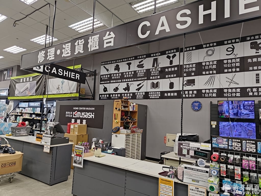 ▲ 收銀與退貨櫃台區上方標示多項服務項目,包括木材切割、宅配、安裝與維修等。