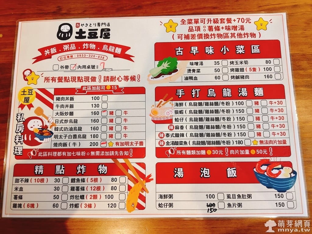 「土豆屋」位在環東路435-1號,靠近楊梅天成醫院。店家提供丼飯、炒麵、炒烏龍、烏龍麵、燒肉飯、炸物、小菜和飲料等,全菜單 +70 元可升級套餐(+ 薯條與味噌湯,可補差價換炸物區其他炸物),選擇多,為一家日式料理店。有菜單可參考,劃記點餐,內用先付款 💸,收現金為主,價位中等,無發票 🧾。有內用空間,餐具、醬料自取 🥢,有免費無糖茶可無限取用。現點現做,約 20 ~ 25 分鐘全送上。吃完要將餐具與垃圾放置於回收區。