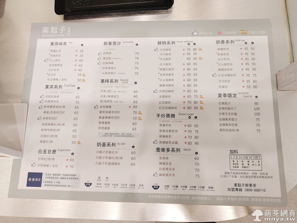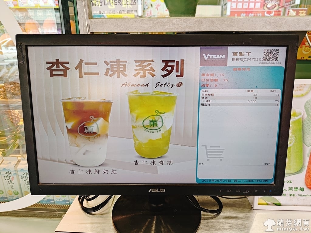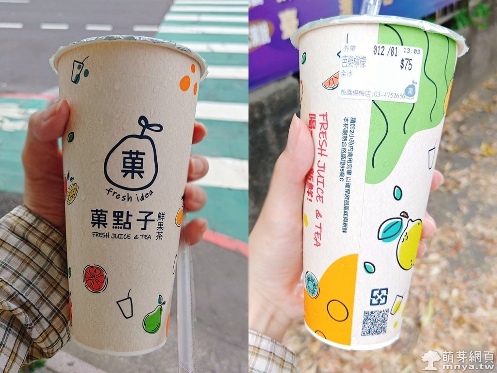 「菓點子(楊梅店)」位在環東路449號,楊梅天成醫院附近。店家賣菓原味茶、菓茶、白玉甘蔗、鮮菓雪沙、白玉甘蔗、菓榨、奶蓋、鮮奶、手炒黑糖、養樂多、奶香和夏季限定系列飲品,選擇多,可以自訂糖度(全糖、7 分糖、5 分糖、3 分糖、1 分糖、無糖)與溫度冰量(全冰、7 分冰、5 分冰、3 分冰、1 分冰、去冰、溫、熱),還能加料(+5 元有愛玉/奇亞籽/仙草凍、+10 元有波霸/蘆薈/奶酪布丁、+15 元有紅豆/杏仁凍),為一家連鎖飲料店。無內用空間,僅供外帶。有價目表可參考,先付款 💸,可現金或刷卡支付,價格中等,有發票可存載具 🧾。現點現做,製作速度快,約 3 分鐘左右送上櫃台。