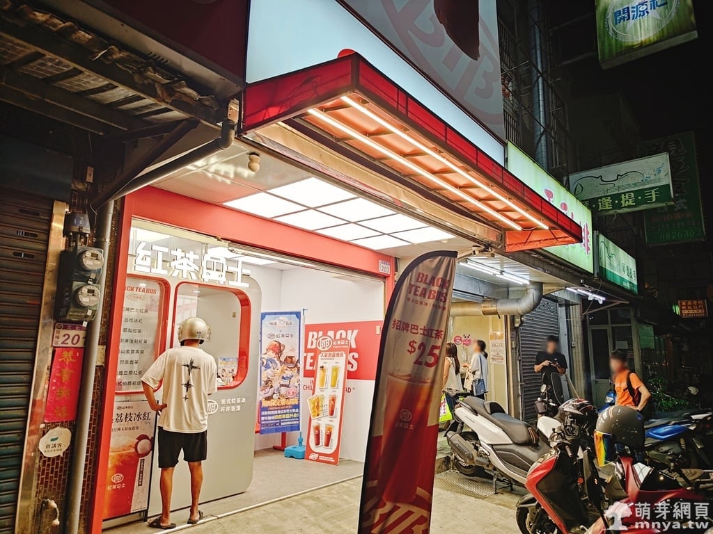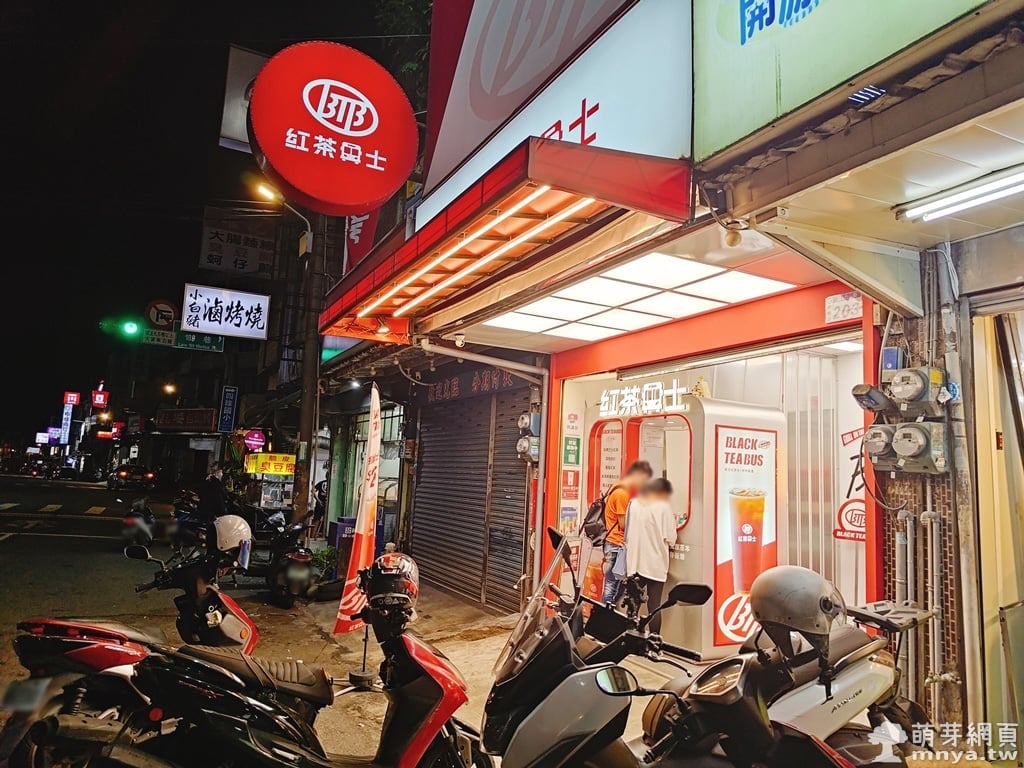 ▲ 紅茶巴士門市夜晚亮起紅白招牌,設計醒目又年輕,路過都很容易注意到,給人清爽又現代的感覺。