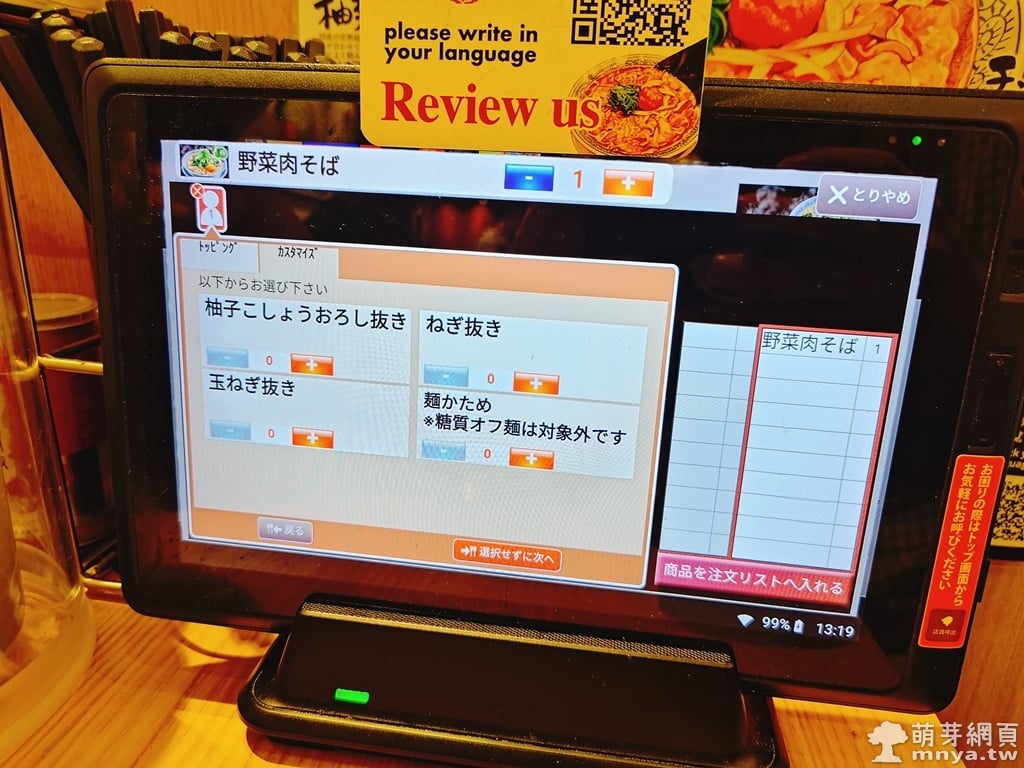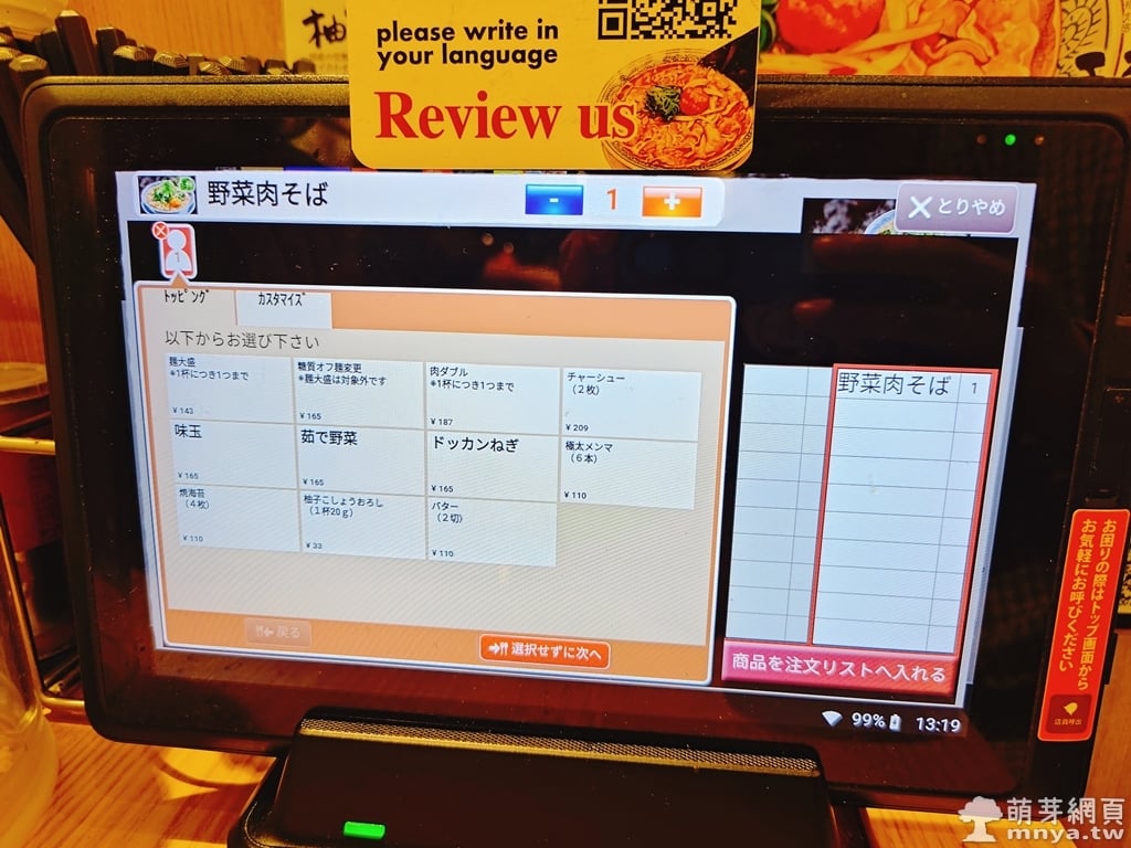 ▲ 點選「野菜肉そば」後還能自由加料或客製,像是加味玉、叉燒、蔥花或滷筍乾,都能直接在平板上完成設定。