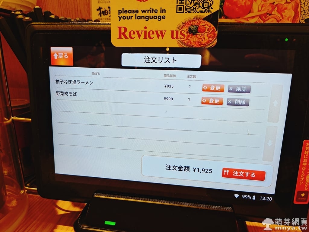 ▲ 最後確認訂單畫面,我們點了柚子蔥鹽拉麵與野菜肉蕎麥麵各一碗,共 1,925 日圓。操作簡單快速,完全不需與店員對話。