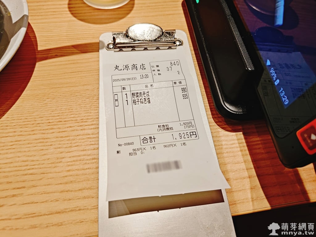 ▲ 最後附上帳單,兩碗拉麵合計 1,925 日圓,價格相當合理。以這份量與品質來說,丸源拉麵的性價比確實高得令人滿意。