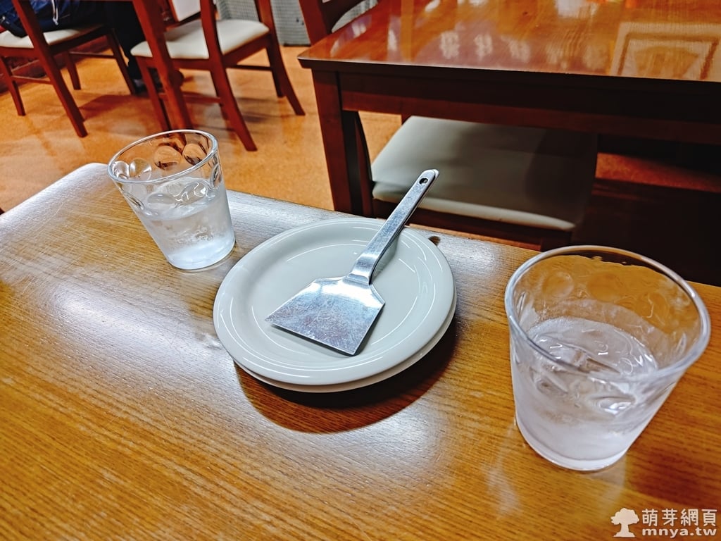 ▲ 入座後店員會立刻送上冰水與小鏟子,後者是吃お好み焼き時的必備工具,用來直接從鐵板上分切、享用剛出爐的熱騰騰美味。