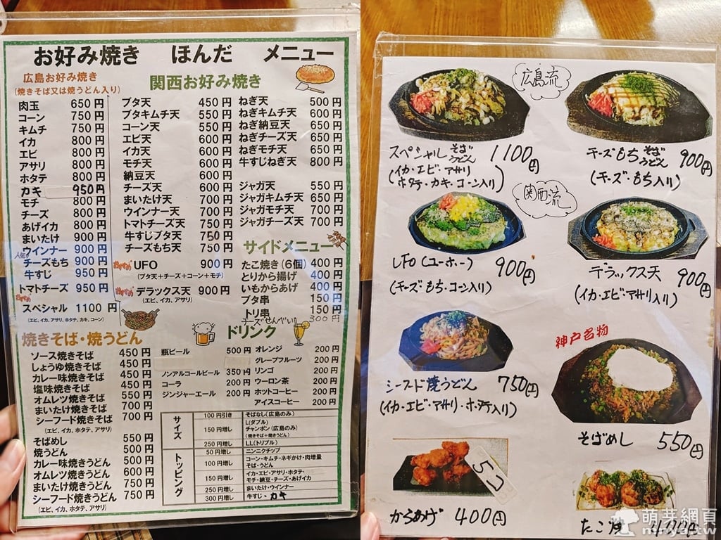 ▲ 店內的完整菜單與圖片版對照,左側是詳細價格與分類,右側則有實拍料理照。從廣島風到關西風款式一應俱全,價格親民、選擇豐富。