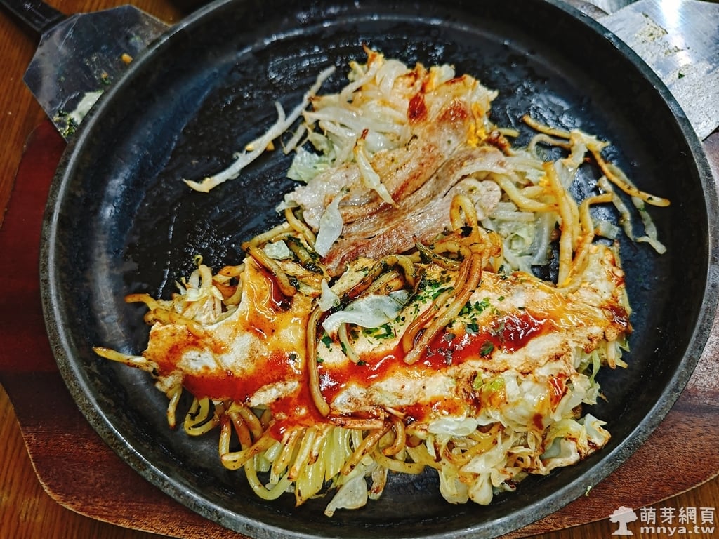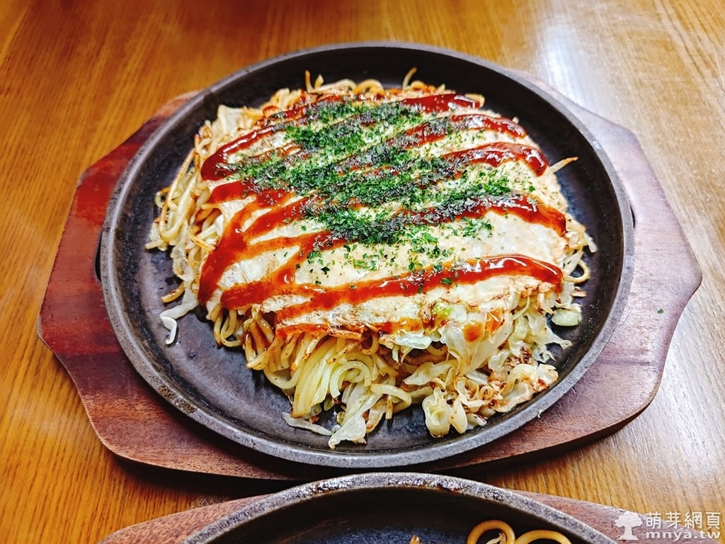 ▲ 広島お好み焼き(肉玉,650日圓)登場!上層鋪滿蛋皮與醬汁,層層堆疊的麵與蔬菜在鐵板上香氣四溢,是經典的廣島風作法。