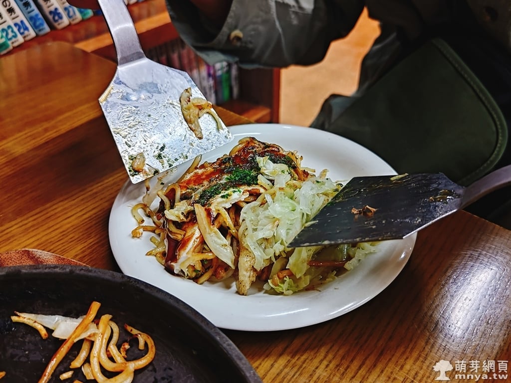 ▲ 使用小鏟子分切お好み焼き,是在日本吃鐵板料理時的小樂趣。外皮焦脆、內層柔軟,結合蔬菜甜味與醬香,口感豐富。