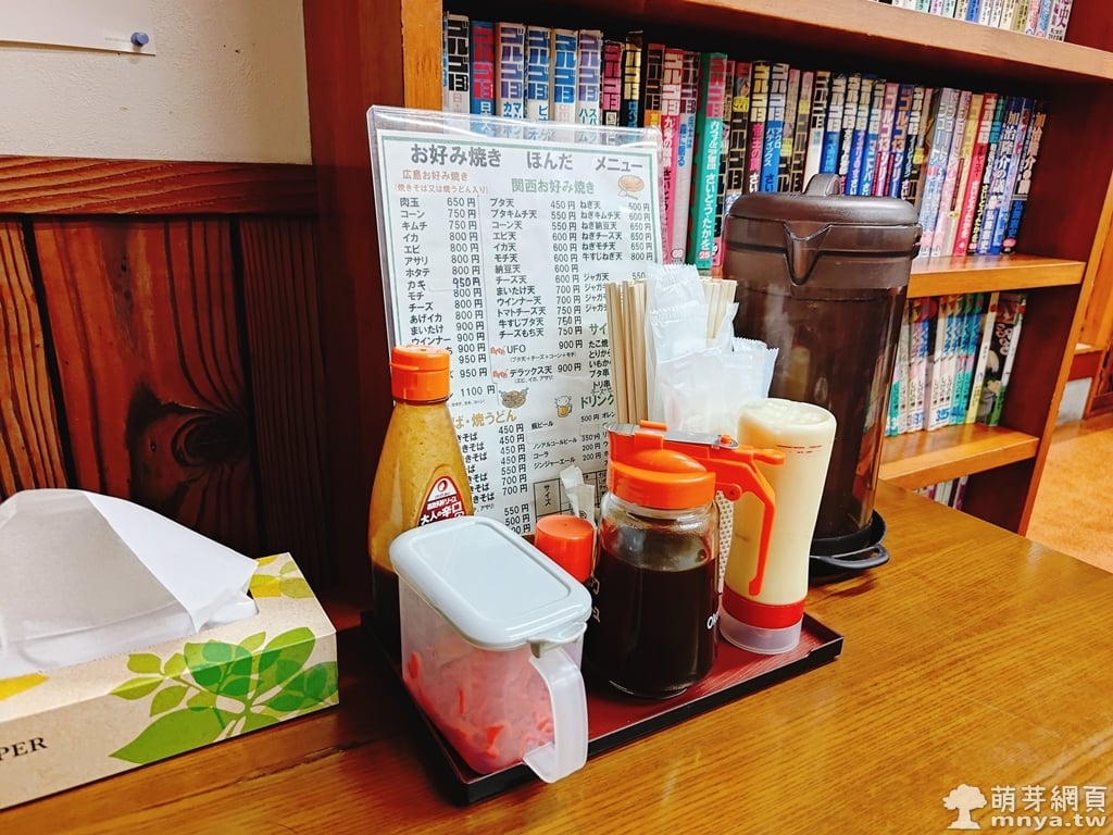▲ 桌上備有各式醬料:章魚燒醬、日式美乃滋、紅薑絲與專用醬汁一應俱全。牆邊還有漫畫書架,讓單人用餐也不無聊。