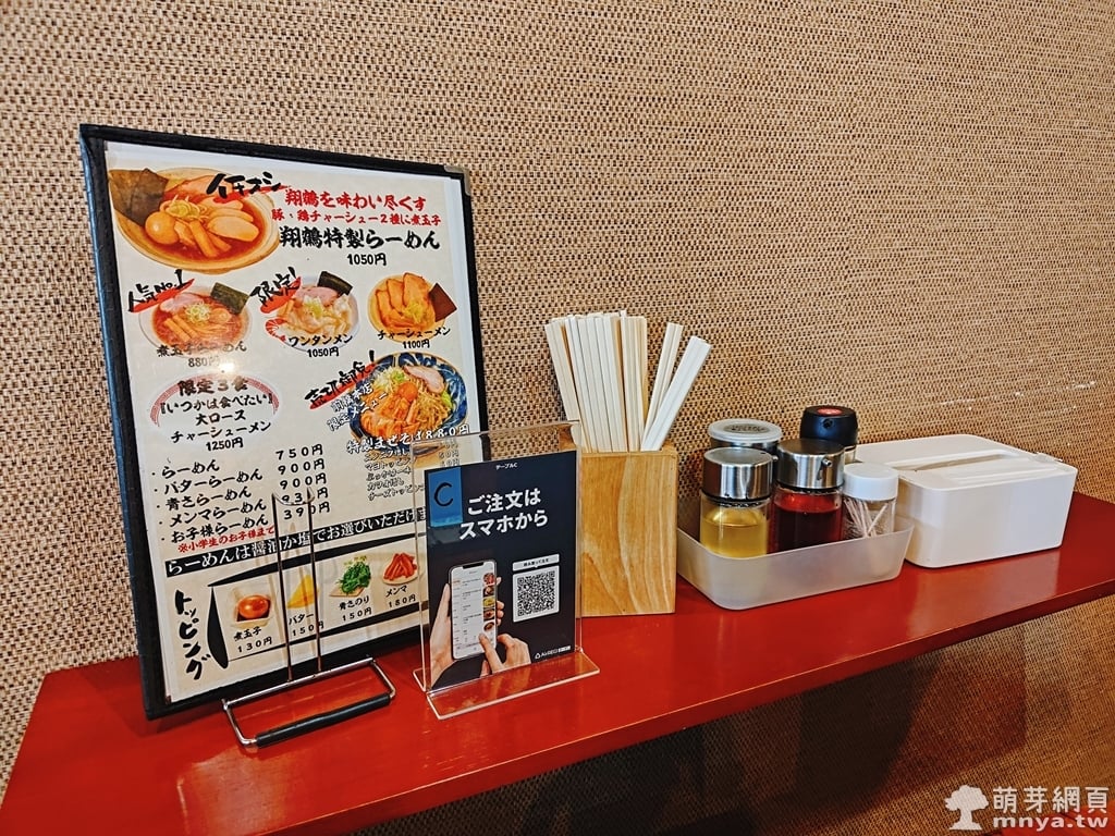 ▲ 桌上放有醬油、辣油、胡椒、牙籤與筷子等,整潔乾淨。旁邊的菜單圖示清楚,主打「翔鶴特製拉麵」與多款經典口味。