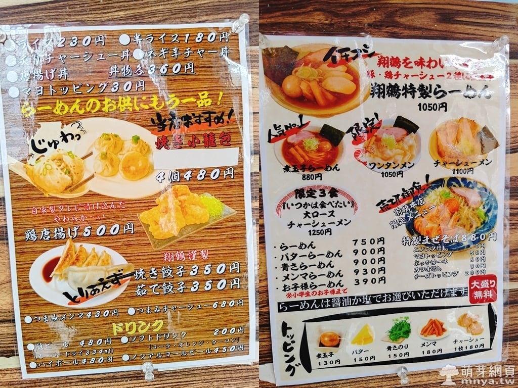 ▲ 菜單上完整列出拉麵與配菜價格:煮蛋、叉燒、餃子、炸雞、小籠包等應有盡有,從單點到套餐都能自由搭配,且拉麵升級大份量免費!