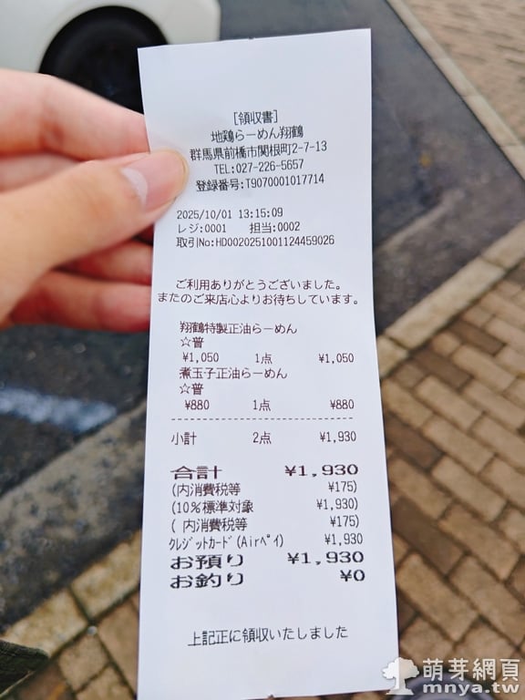 ▲ 這次我們共點了兩碗拉麵,合計 1,930 日圓。翔鶴特製醬油拉麵 1,050 日圓、煮蛋醬油拉麵 880 日圓,價格實在,物超所值。