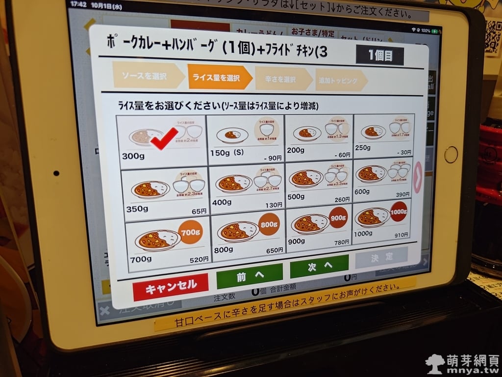 ▲ 接著選擇飯量,從 150g 到 1000g 皆可調整,這次我們點 300g,對一般成人來說份量剛好又不過飽。