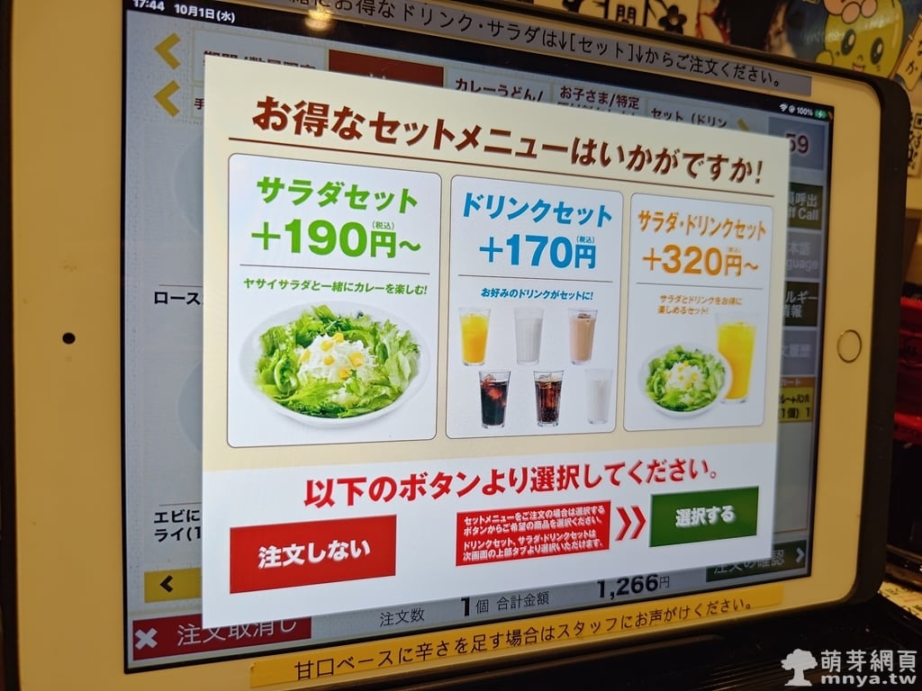▲ 系統貼心詢問是否要加購套餐,沙拉與飲品組合價實惠,也能直接跳過,操作過程簡單明確。