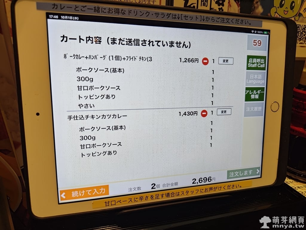 ▲ 我們還點了手工雞排咖哩,兩份主餐共 2,696 日圓,正式送單準備進廚房。