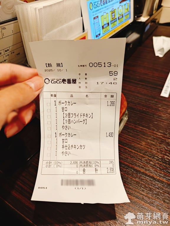▲ 結帳金額共 2,696 日圓,詳細列出兩份餐點內容與價格,和預期一致。這頓在高崎的咖哩晚餐,劃下完美句點。