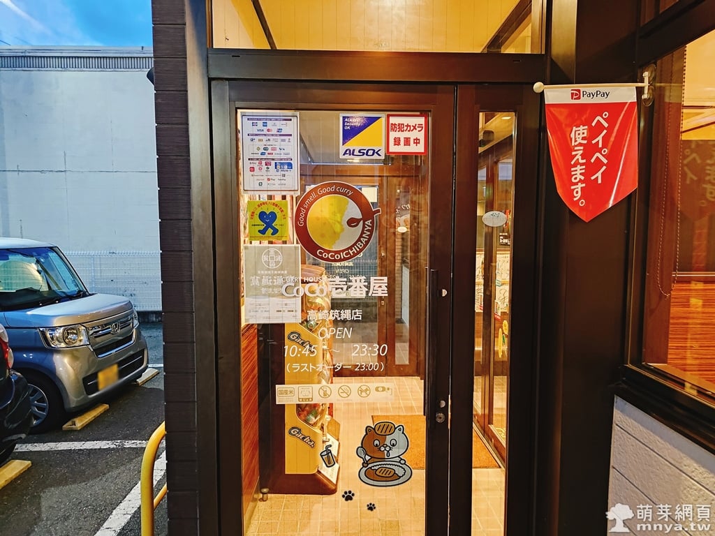 ▲ 入口處貼有營業時間與付款方式,支援 PayPay 等電子支付。門上還有可愛的 CoCo 壱番屋吉祥物圖案,充滿親切感。
