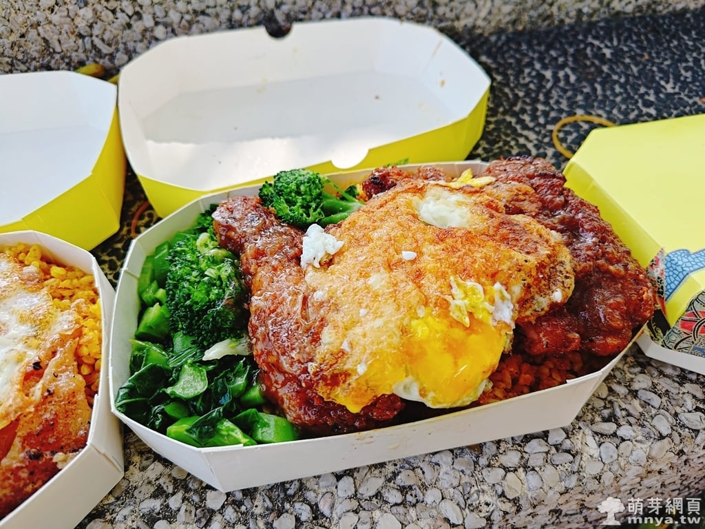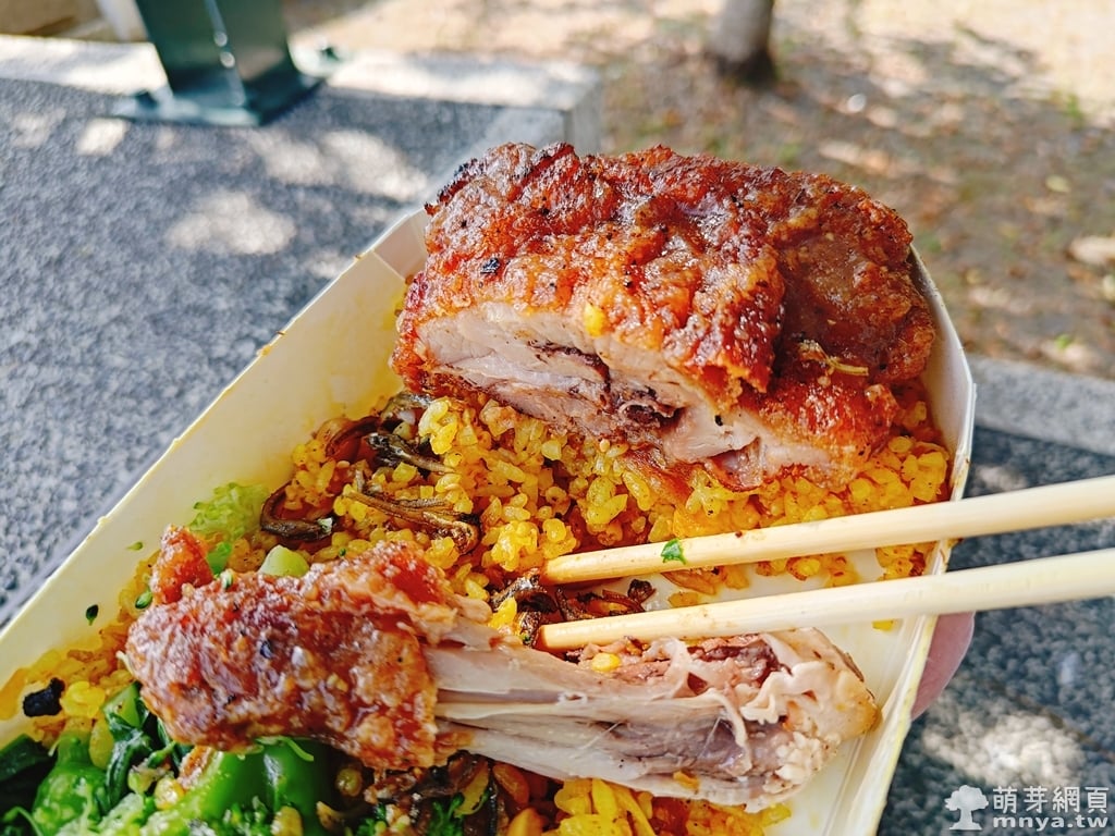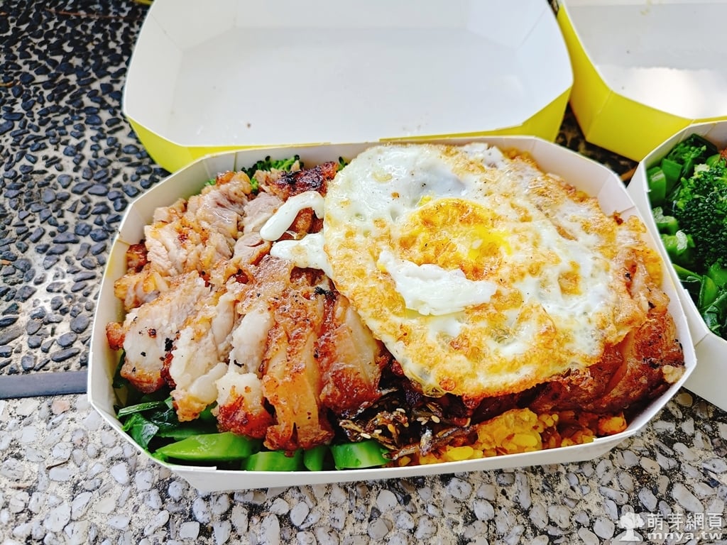 我們點了「五花飯(100元)」X2 與「雞腿飯(100元)」X2。本來其實想點烤肉飯,可惜剛好當天沒供應,所以改點其他有的餐點。本來以為是白飯為基底,沒想到是薑黃飯,有花椰菜、荷包蛋、花生粒、小魚乾等配料,份量飽滿,老闆娘說因為隔天沒營業,所以肉量有增量,總之就是塞好塞滿,甚至還問我們要不要加飯,不過我們怕吃不下決定還是正常份量就好,不過整體上來說份量還是超乎想像,以我來說可以吃非常飽,肉也是很好吃,CP 值相當高,實在令人回味無窮 😋。