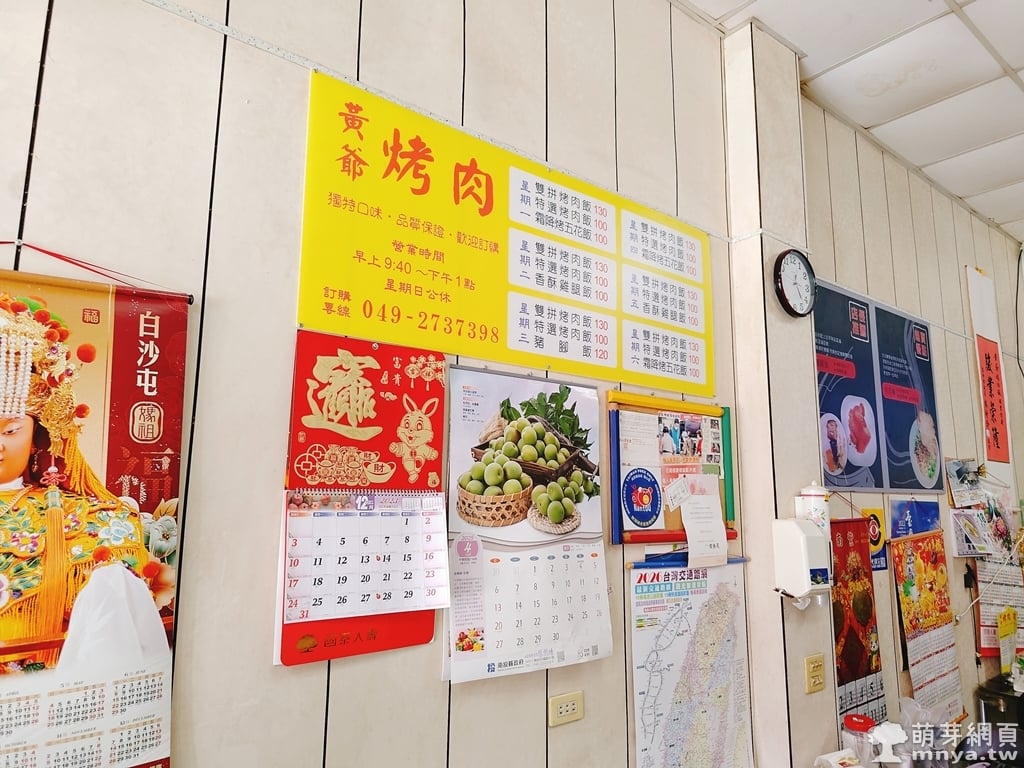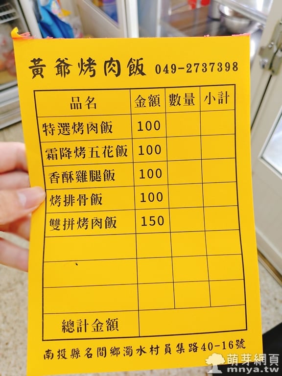 「黃爺烤肉飯」位在員集路40-16號,靠近濁水火車站。店家提供烤肉飯、五花飯、雞腿飯、排骨飯等,以現場有供應項目為主,為一家小吃店。有點餐單可參考,劃記或口頭點餐,價位中偏低,外帶取餐付款 💸,僅可使用現金,無發票、收據 🧾,有內用空間,座位不多。現點現做,我們外帶,現點現做,等候大概 15 ~ 20 分鐘完成。