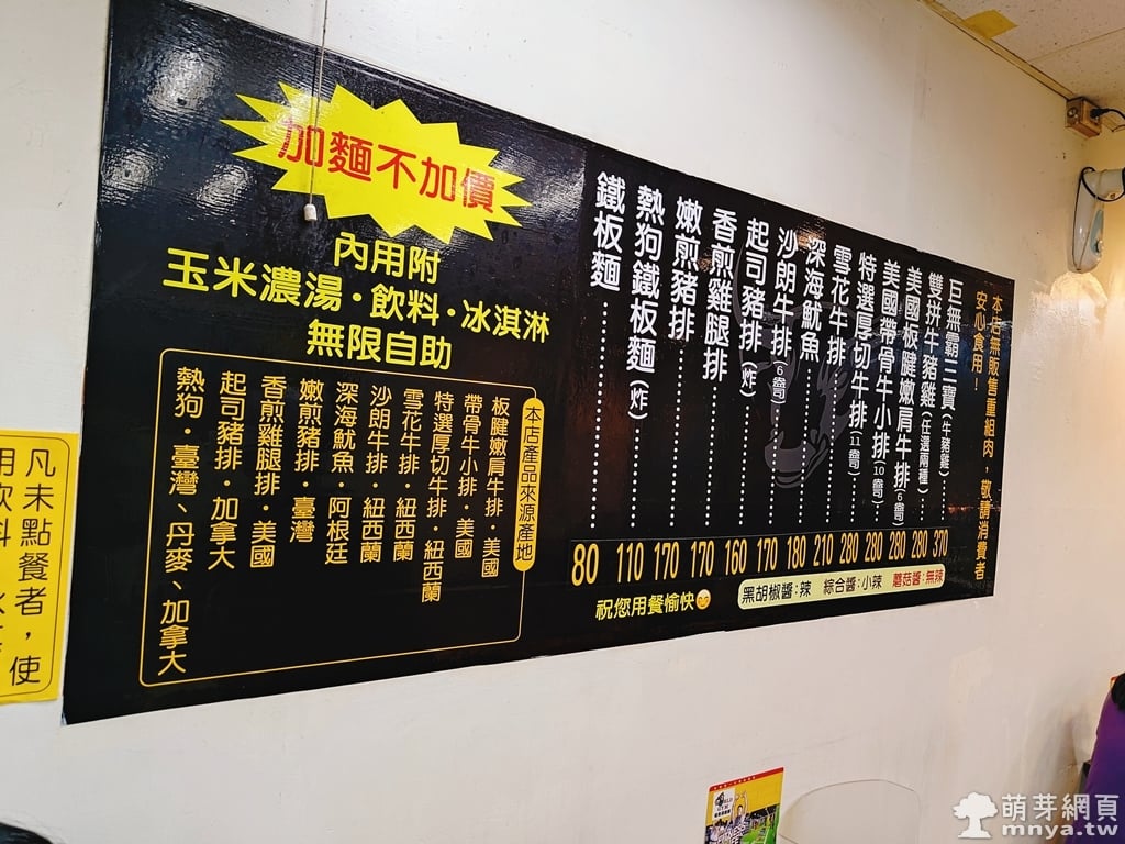 我點「沙朗牛排(蘑菇醬,170元)」;家人點了「沙朗牛排(蘑菇醬,170元)」X2、「鐵板麵(綜合醬,80元)」。麵條是黃麵,可以免費加麵,吃起來飽足感比較大,牛排本身較薄。蘑菇醬不會辣,綜合醬則是小辣。玉米濃湯與冬瓜茶味道較淡。冰淇淋有四種口味。整體很便宜且不錯吃 😋。