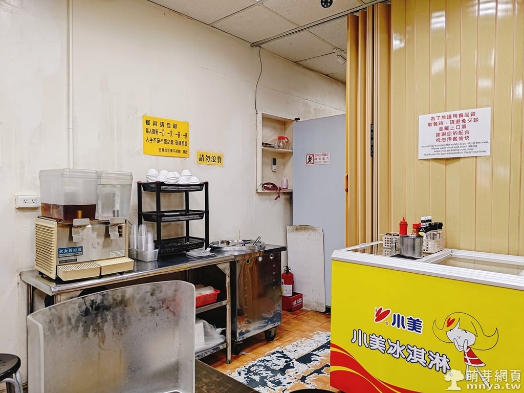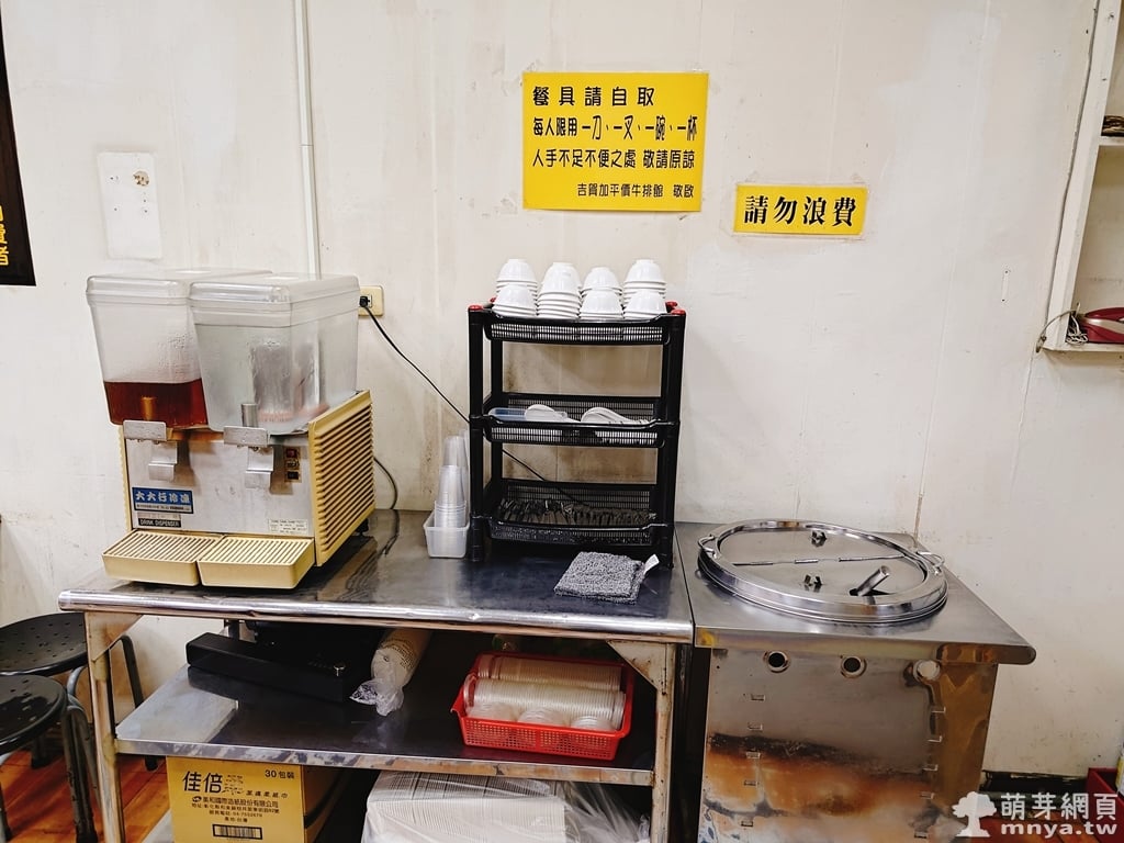▲ 冬瓜茶、開水、玉米濃湯、餐具自取區。
