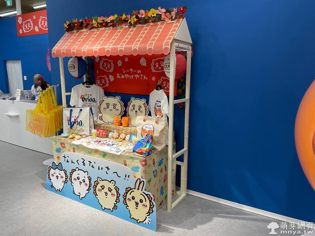 ▲ 以沖繩風屋頂造型打造的展示攤位上,陳列 Orion 聯名周邊、帆布袋與造型吊飾,融合傳統與可愛風格。