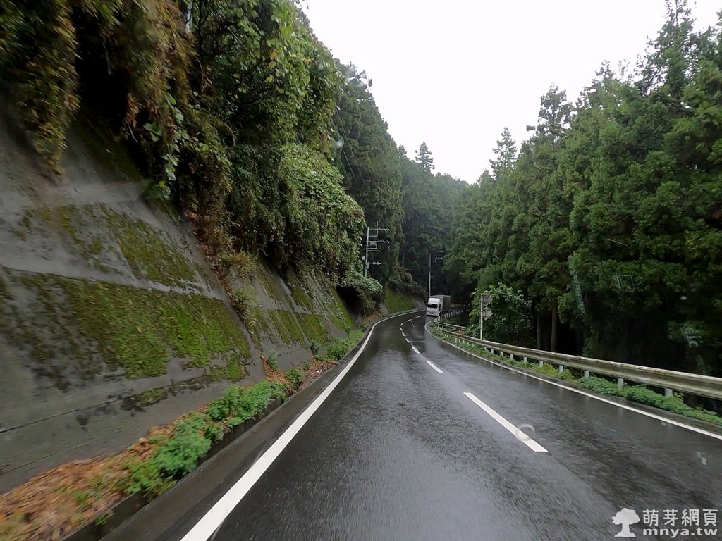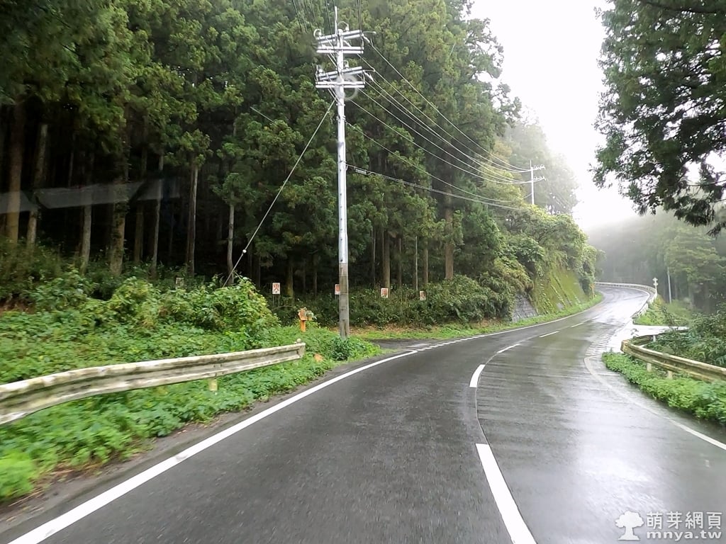▲ 道路穿越杉林間的坡段,兩側設有護欄與擋土牆,雨後路面濕滑,需注意車速。