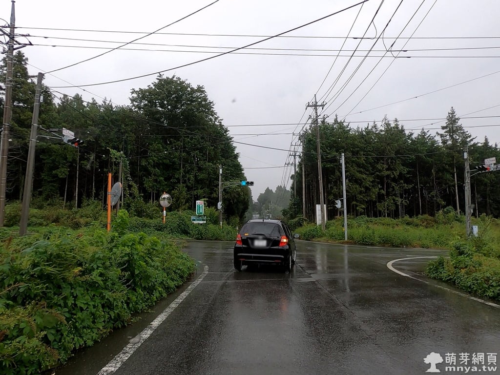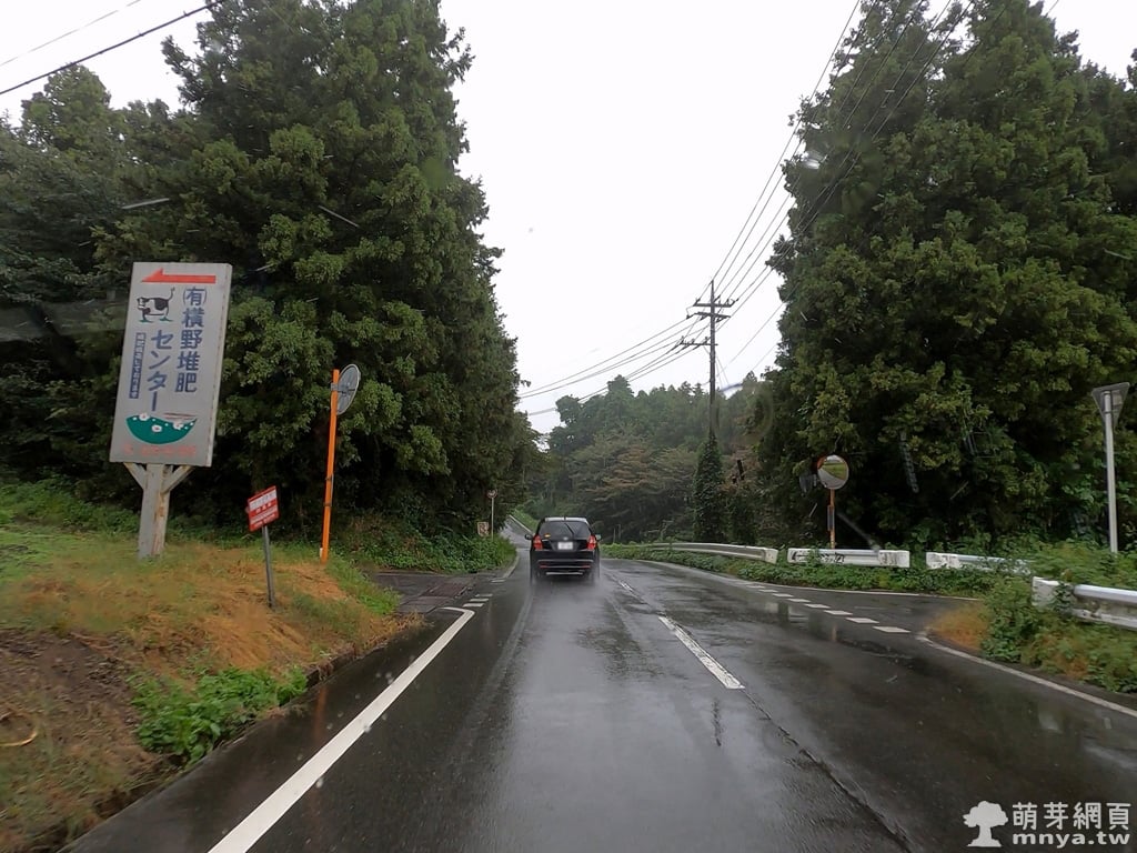 ▲ 道路逐漸進入山林地帶,兩側為濃密杉林。左側立有「(有)横野堆肥センター」指示牌,可見此區仍以農業設施與肥料生產為主。