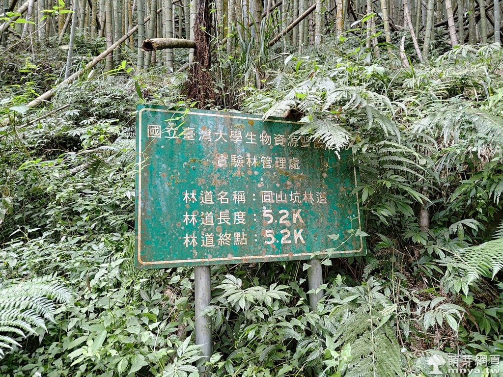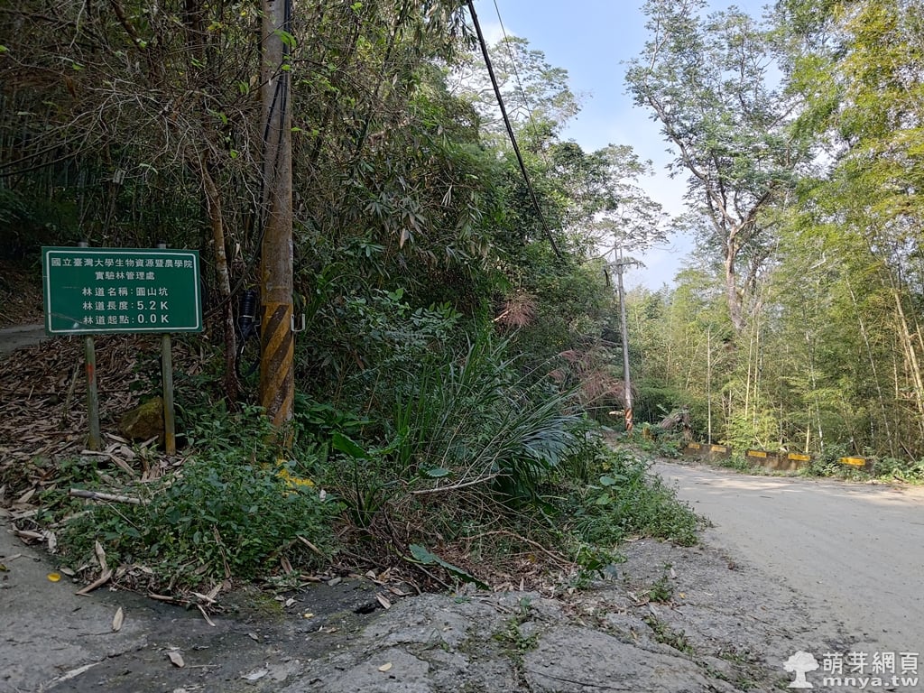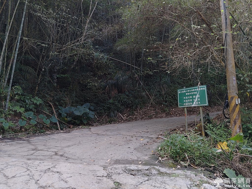 此次圓山坑林道順樁全線記錄,由投56線(田底巷)里程 13.6K 岔路右入,一旁有林道 0K 起點牌,中途有幾處三岔路,還會看到一顆「台大國有林界 458」水泥柱。全線皆為水泥鋪面,幾處崩塌及路基塌陷處須留意。4K 有一片茶園,4.5K 有狗屋,我們在 5.2K 終點牌後最後的三岔路口停車,右上約 200 公尺抵達最終水泥農路路底,即鳳凰山北峰登山口,一旁有狗屋,當下有隻不會叫且很怕人的黑狗被拴在這裡。