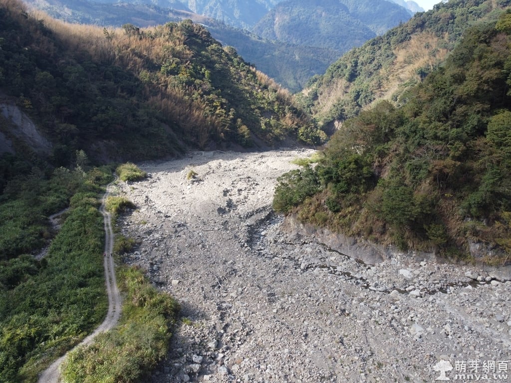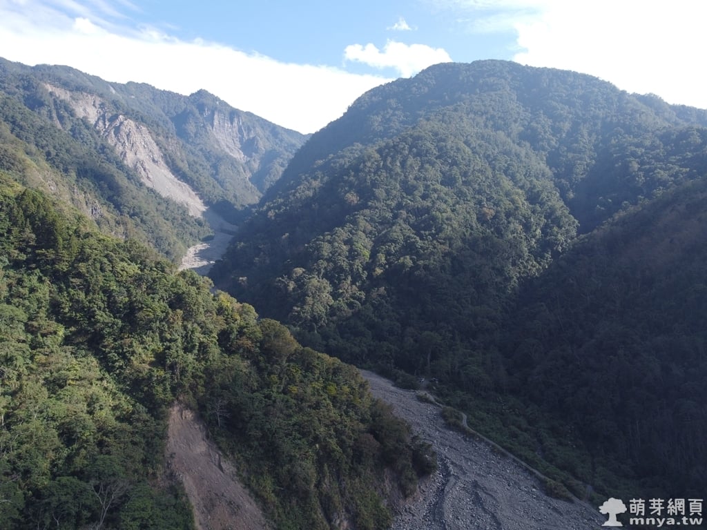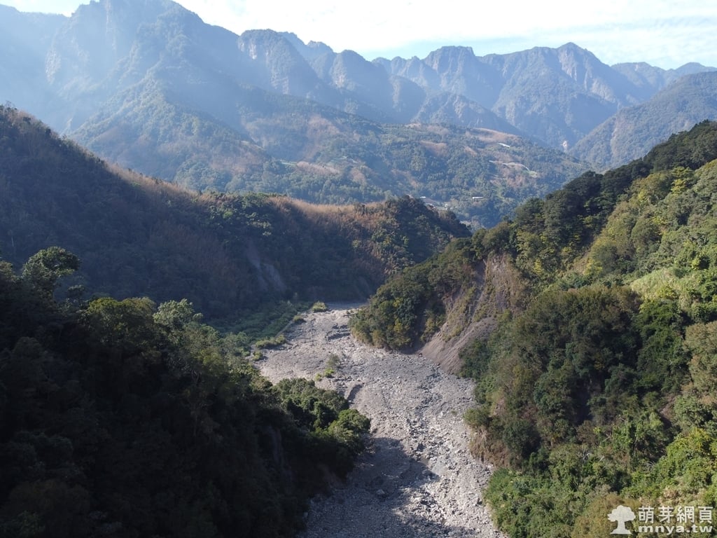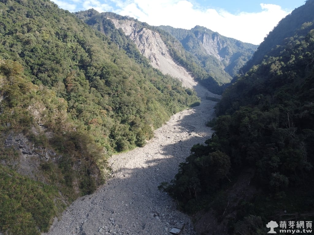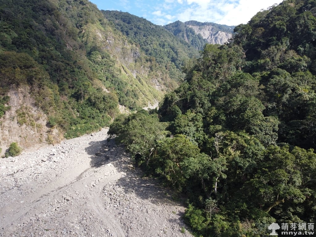▲ 空拍機往上游飛,可以看到上游有大片崩塌地,應該就是土石流的發源處。