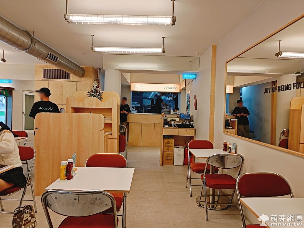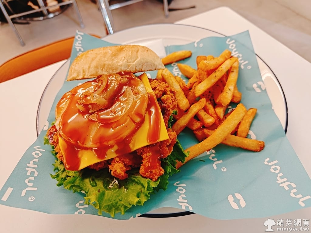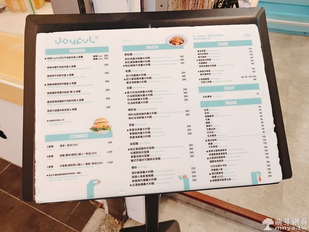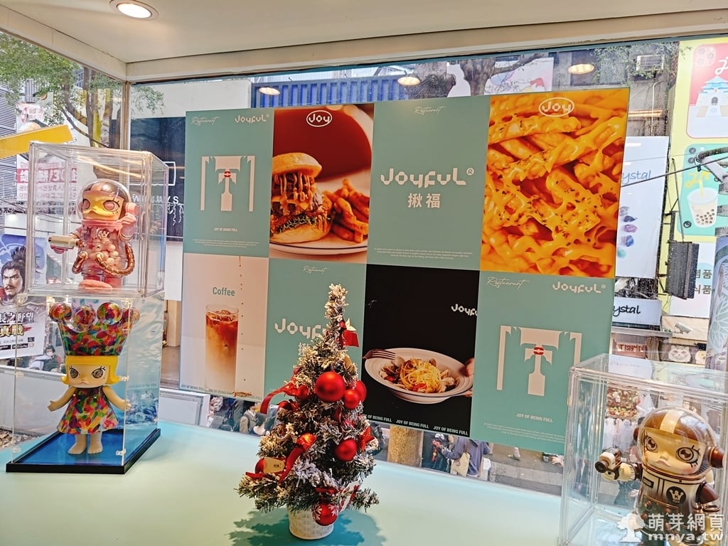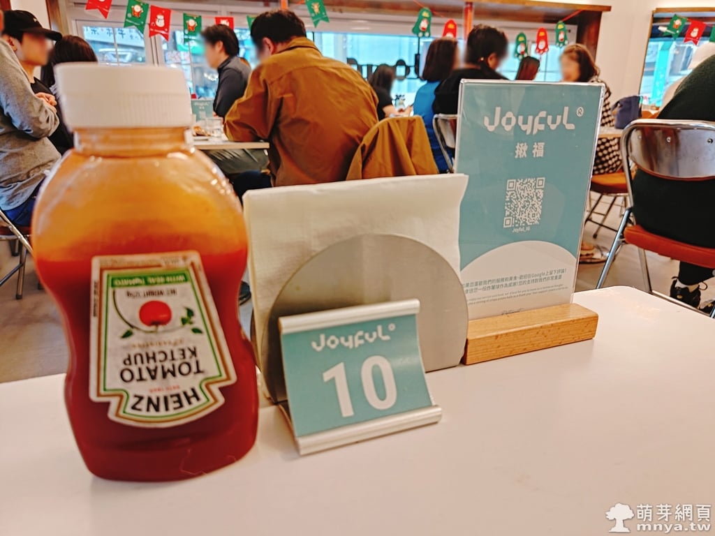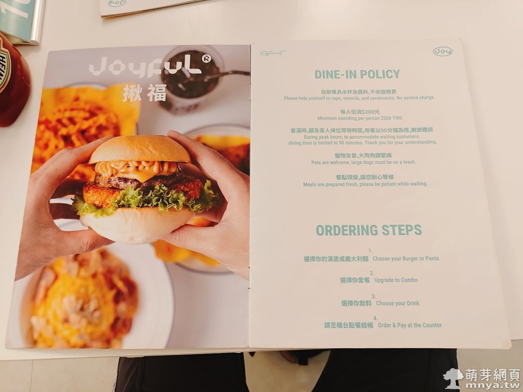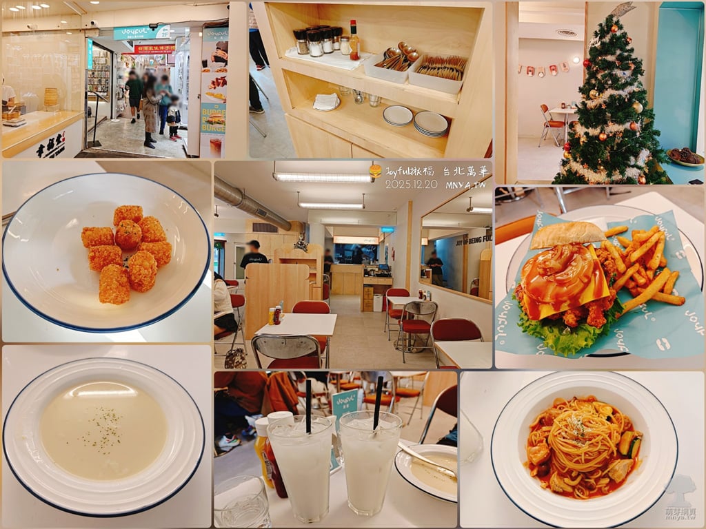 「Joyful揪福」位在漢中街103號2樓,西門町商圈內。店家提供漢堡、義大利麵、炸物和飲料等,為一家早午餐及義大利麵店。有菜單可以參考,口頭點餐,櫃台現金或信用卡先結帳,價位中等偏小貴,有發票可存載具 🧾。有單層寬敞內用空間,環境乾淨,座位很多,餐具、醬料自取 🥢。現點現做,飲料先上,約 25 分鐘內全送上。Google 地點評論可免費拿炸薯球一份。店內有廁所可利用。