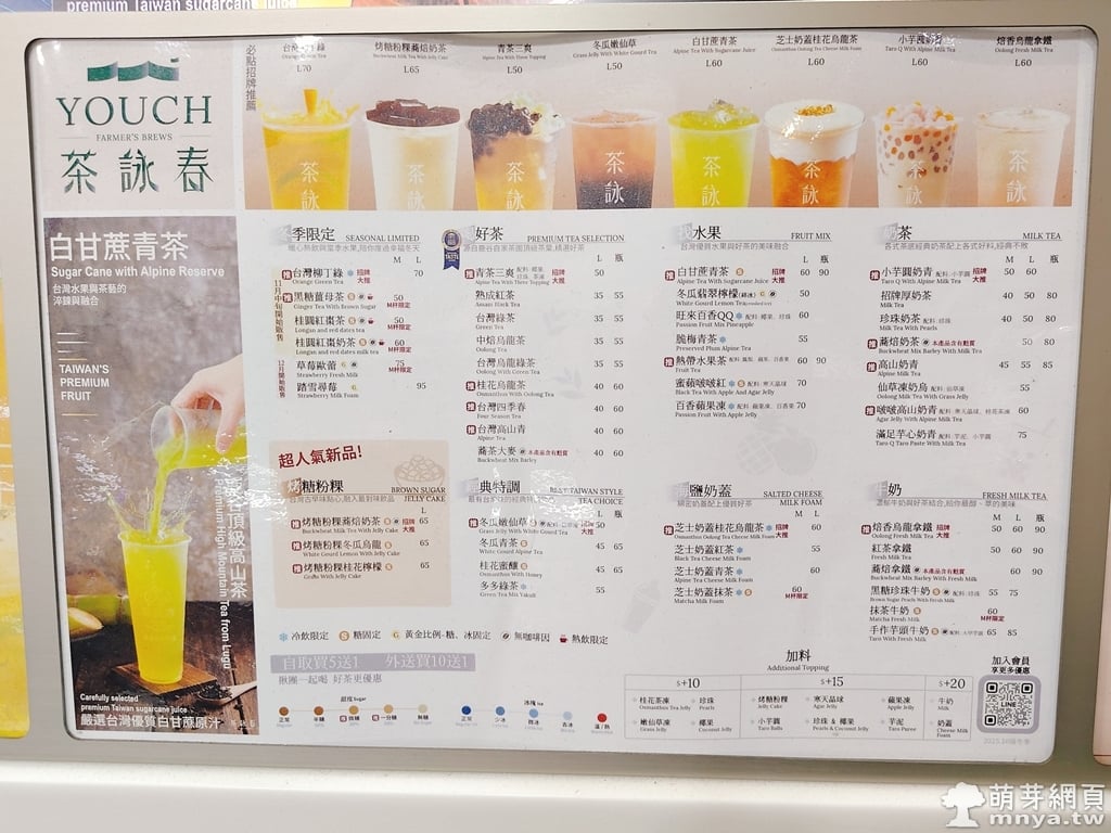 「茶詠春(楊梅埔心店)」位在中興路12號,埔心市區內。店家提供冬季限定、好茶、水果、奶茶、烤糖粉粿、經典特調、海鹽奶蓋和牛奶等飲品,可以自訂甜度(正常、半糖、微糖、一分糖、無糖)與冰度(正常、少冰、微冰、去冰、溫/熱),可加料,+10 元(桂花茶凍、珍珠、嫩仙草凍、椰果)、+15 元(烤糖粉粿、寒天晶球、蘋果凍、小芋圓、珍珠&椰果、芋泥)、+20 元(牛奶、奶蓋),選擇多,為一家連鎖手搖飲料店。有簡易內用空間,外帶為主。先付款 💸,可刷行動支付,有發票可存載具 🧾。現點現做,等候時間約 3 ~ 5 分鐘左右。