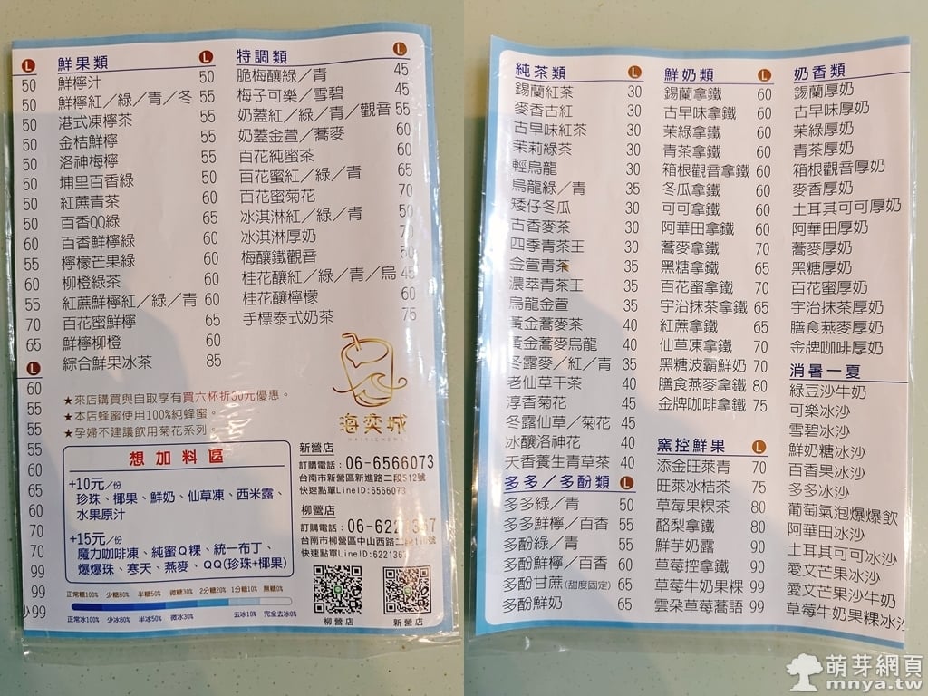 「海奕城手作茶飲(柳營店)」位在中山西路二段110號,柳營市區內。店家提供純茶、鮮奶、多多/多酚、鮮果、奶香、消暑、特調等飲品,可以自訂甜度(正常糖、少糖、半糖、微糖、二分糖、一分糖、無糖)與冰度(正常冰、少冰、半冰、微冰、去冰、完全去冰),可加料,+10 元(珍珠、椰果、鮮奶、仙草凍、西米露、水果原汁)、+15 元(魔力咖啡凍、純蜜Q粿、統一布丁、爆爆珠、寒天、燕麥、QQ[珍珠+椰果]),選擇多,為一家連鎖手搖飲料店。無內用空間,外帶為主。先付款 💸,可刷行動支付,有發票可存載具 🧾。現點現做,等候時間約 3 ~ 5 分鐘左右。