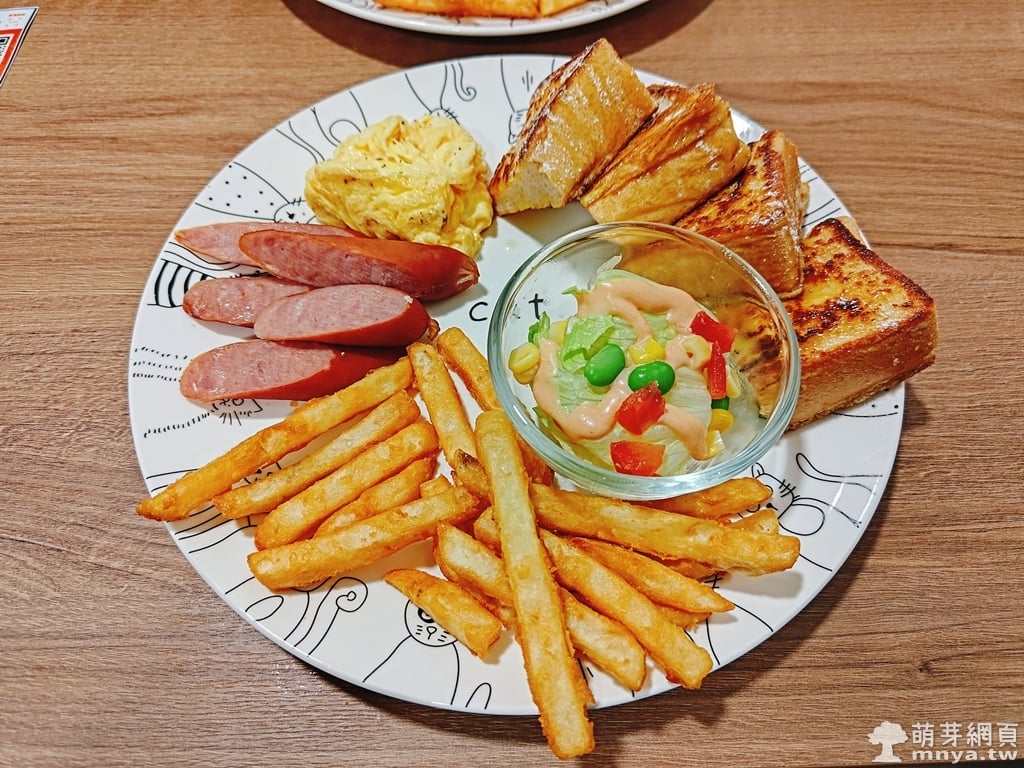 我點「法式楓香特餐(130元)」,有法式吐司(淋上楓糖漿)、斜切德式香腸、美式炒蛋、黃金脆薯和小碗生菜沙拉(淋上千島醬),好吃 😋;我弟點了「美式飽足特餐(110元)」,有軟法麵包切片(三片)、斜切德式香腸、美式炒蛋、黃金脆薯、小碗馬鈴薯沙拉。兩份皆可吃飽。