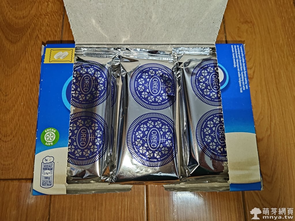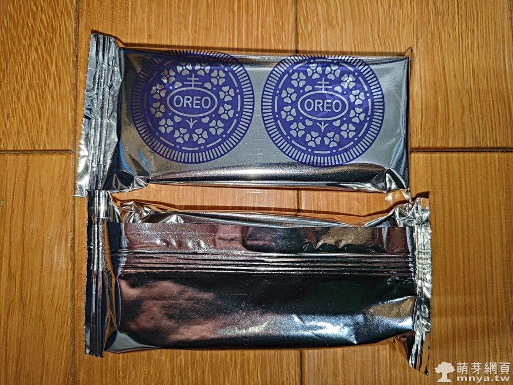 ▲ 近看獨立包裝袋,上方印有深藍色的 OREO 經典餅乾圖樣,整體設計簡約而具現代感。鋁箔包裝的密封性極佳,這種小包裝非常適合隨身攜帶在包包中,無論是上班小憩或是出外遠足,都是補充能量的便利甜點選擇。