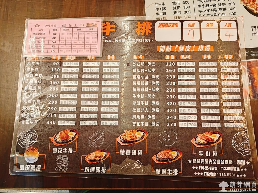我點「精選牛排(雙醬,+酥皮濃湯,230元)」;家人點了「精選牛排(雙醬,+酥皮濃湯,230元)」X2、「鐵板麵(雙醬,+酥皮濃湯,160元)」。醬料提供蘑菇醬、黑胡椒醬及綜合醬。排餐附荷包蛋,麵量適中,牛排較薄,嫩且好切,好吃 😋。酥皮濃湯的酥皮好吃,但濃湯普普。冰淇淋個人最喜歡焦糖口味,其餘還有巧克力、情人果等口味。難得有提供沙拉的牛排館,CP 值高!