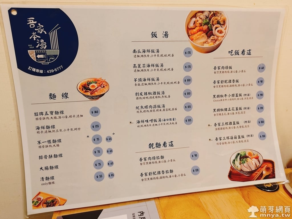 「吾家本湯 Woo Soup」位在中豐路南勢一段126號。店家提供麵線、飯湯、乾麵、飯、小菜、飲品、小點、湯品和伴手小禮等,為一家小吃店。有菜單可參考,掃碼點餐,價位中等,內用先付款 💸,可現金、LINE Pay、TWQR 付款,無發票、收據 🧾,有內用空間,環境乾淨舒適,餐具、醬料自取 🥢。送餐速度快,我們等候大概 12 分鐘內全送上。店內有廁所可利用。