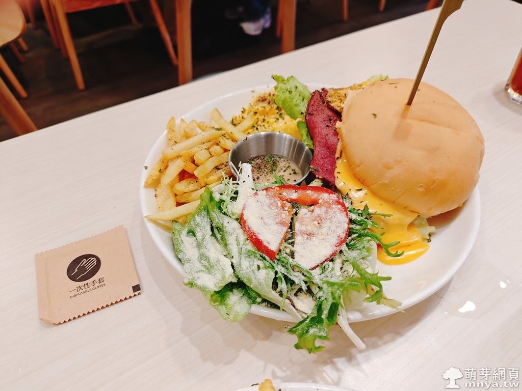 ▲ 美式漢堡配起司煙燻牛肉(起司炒蛋、生菜沙拉、薯條),附手扒雞手套。