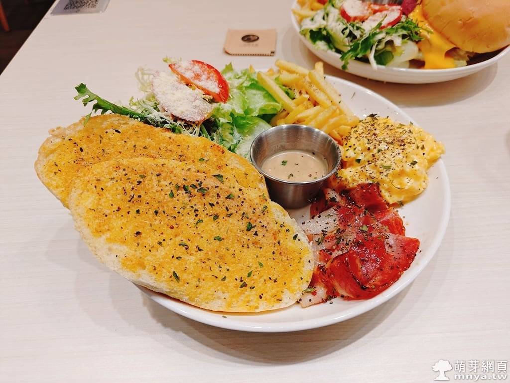 ▲ 蒜香奶油麵包配蜜汁培根(起司炒蛋、生菜沙拉、薯條)。