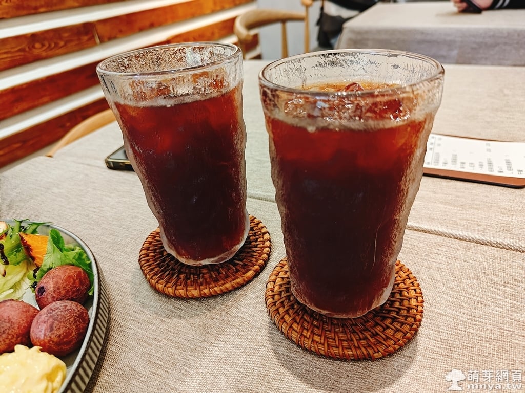 ▲ 隨餐附贈的冰紅茶,店家貼心地使用編織杯墊,茶色深沉透亮。我們調整為半糖,喝起來甜度適中且帶有淡淡茶香,搭配大份量的早午餐盤一同享用,清爽解膩又滿足。