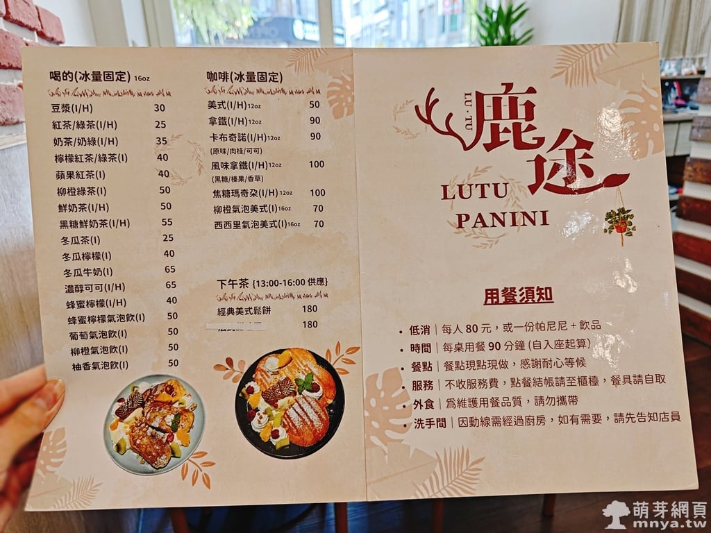 「鹿途·帕尼尼 Lutu·Panini」位在中北路二段361號。店家提供帕尼尼、輕食選物、早午餐、定食、義大利麵、燉飯、單點、咖啡和飲料等,為一家早午餐、義式料理店。有菜單可參考,櫃台口頭點餐,僅能用現金支付。價位中等,無發票、有收據 🧾。有內用空間,座位不算多,環境乾淨、綠意盎然,餐具自取 🥢。現點現做,約 10 分鐘左右全送上。