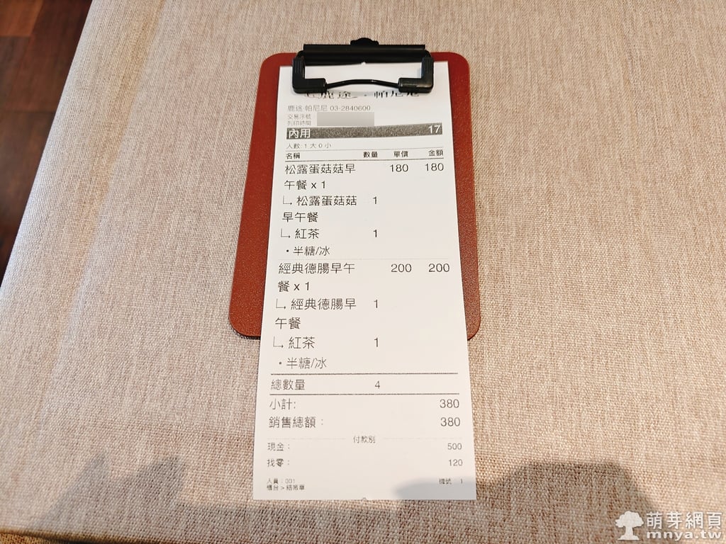 ▲ 當天的點餐收據明細,點了松露蛋菇菇與經典德腸兩款早午餐,總計 380 元。店家不額外收取服務費,價格在早午餐界中相當平實親民。