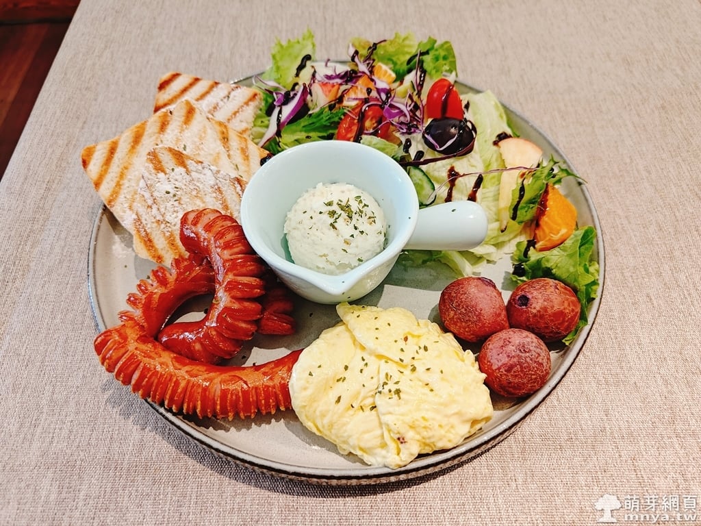 ▲ 經典德腸早午餐拼盤,視覺效果滿分。螺旋狀切開的德式香腸焦香脆口,配上撒了糖粉且印有漂亮烙痕的熱壓吐司,還有配色鮮豔的水果沙拉與紫色地瓜球,豐富度十足。
